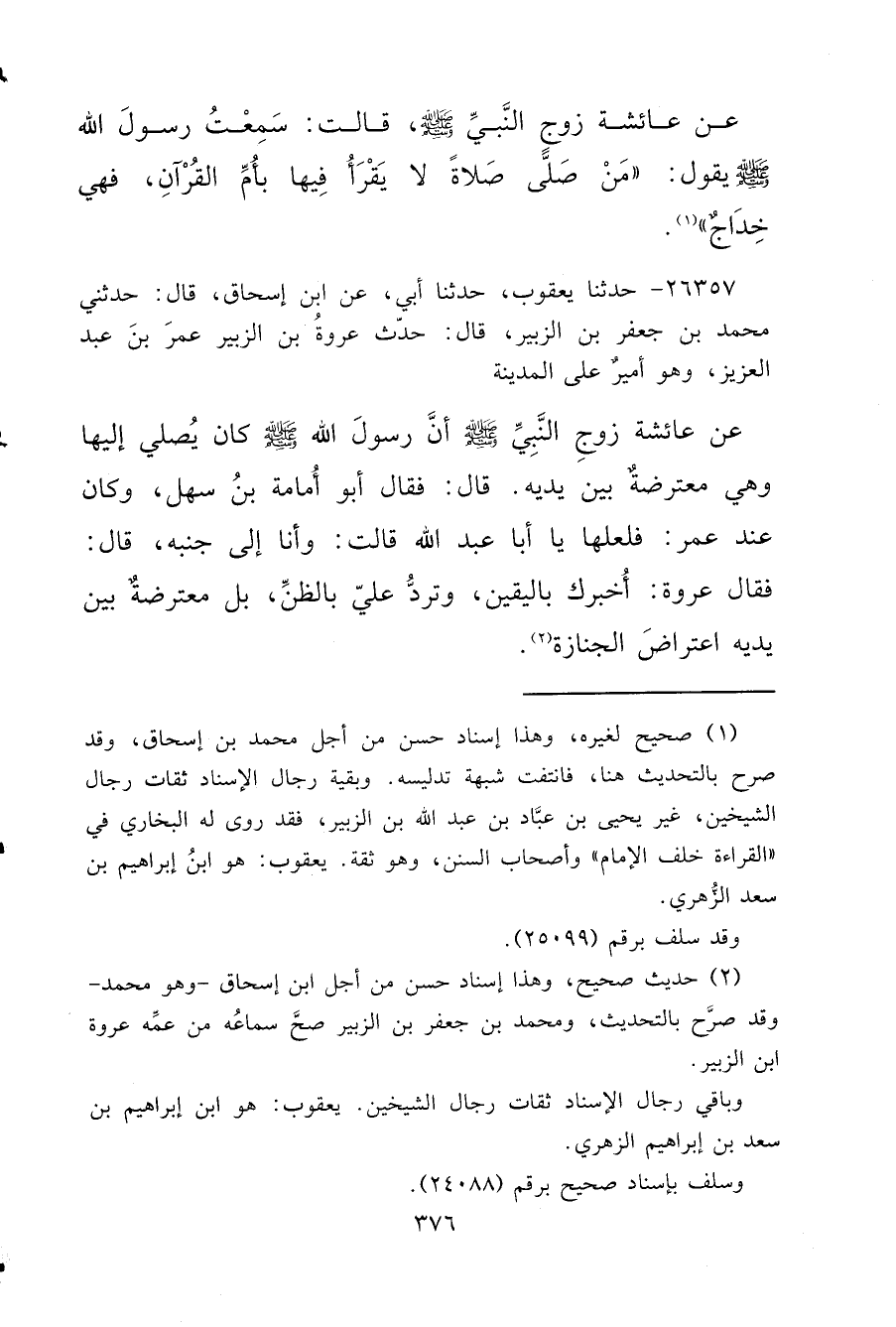 ٢٦٣٥٧ - حَدَّثَنَا يَعْقُوبُ، حَدَّثَنَا أَبِي، عَنِ ابْنِ إِسْحَاقَ، قَالَ: حَدَّثَنِي مُحَمَّدُ بْنُ جَعْفَرِ بْنِ الزَّبِيرِ، قَالَ: حَدَّثَ عُرْوَةُ بْنُ الزَّبِيرِ، عُمَرَ بْنَ عَبْدِ الْعَزِيزِ وَهُوَ أَمِيرٌ عَلَى الْمَدِينَةِ عَنْ عَائِشَةَ، زَوْجِ النَّبِيِّ صَلَّى اللهُ عَلَيْهِ وَسَلَّمَ " أَنَّ رَسُولَ اللهِ صَلَّى اللهُ عَلَيْهِ وَسَلَّمَ كَانَ يُصَلِّي إِلَيْهَا وَهِيَ مُعْتَرِضَةٌ بَيْنَ يَدَيْهِ ". قَالَ: فَقَالَ أَبُو أُمَامَةَ بْنُ سَهْلٍ، وَكَانَ عِنْدَ عُمَرَ: فَلَعَلَّهَا يَا أَبَا عَبْدِ اللهِ قَالَتْ: وَأَنَا إِلَى جَنْبِهِ، قَالَ: فَقَالَ عُرْوَةُ: أُخْبِرُكَ بِالْيَقِينِ، وَتَرُدُّ عَلَيَّ بِالظَّنِّ، بَلْ " مُعْتَرِضَةٌ بَيْنَ يَدَيْهِ اعْتِرَاضَ الْجِنَازَةِ " (٢)