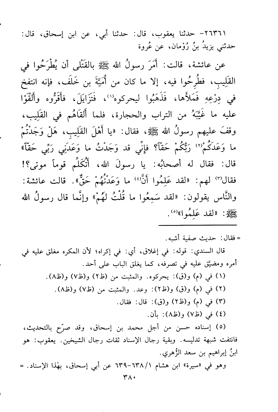 ٢٦٣٦١ - حَدَّثَنَا يَعْقُوبُ، قَالَ: حَدَّثَنَا أَبِي، عَنِ ابْنِ إِسْحَاقَ، قَالَ: حَدَّثَنِي يَزِيدُ بْنُ رُومَانَ، عَنْ عُرْوَةَ، عَنْ عَائِشَةَ، قَالَتْ: أَمَرَ رَسُولُ اللهِ صَلَّى اللهُ عَلَيْهِ وَسَلَّمَ بِالْقَتْلَى أَنْ يُطْرَحُوا فِي الْقَلِيبِ، فَطُرِحُوا فِيهِ، إِلَّا مَا كَانَ مِنْ أُمَيَّةَ بْنِ خَلَفٍ، فَإِنَّهُ انْتَفَخَ فِي دِرْعِهِ فَمَلَأَهَا، فَذَهَبُوا لِيُحَرِّكُوهُ، (١) فَتَزَايَلَ، فَأَقَرُّوهُ وَأَلْقَوْا عَلَيْهِ مَا غَيَّبَهُ مِنَ التُّرَابِ وَالْحِجَارَةِ، فَلَمَّا أَلْقَاهُمْ فِي الْقَلِيبِ، وَقَفَ عَلَيْهِمْ رَسُولُ اللهِ صَلَّى اللهُ عَلَيْهِ وَسَلَّمَ، فَقَالَ: " يَا أَهْلَ الْقَلِيبِ، هَلْ وَجَدْتُمْ مَا وَعَدَكُمْ (٢) رَبُّكُمْ حَقًّا؟ فَإِنِّي قَدْ وَجَدْتُ مَا وَعَدَنِي رَبِّي حَقًّا " قَالَ: فَقَالَ لَهُ أَصْحَابُهُ: يَا رَسُولَ اللهِ، أَتُكَلِّمُ قَوْمًا مَوْتَى؟: فَقَالَ لَهُمْ (٣) : " لَقَدْ عَلِمُوا أَنَّ (٤) مَا وَعَدْتُهُمْ حَقٌّ " قَالَتْ عَائِشَةُ: وَالنَّاسُ يَقُولُونَ: " لَقَدْ سَمِعُوا مَا قُلْتَ لَهُمْ " وَإِنَّمَا قَالَ رَسُولُ اللهِ صَلَّى اللهُ عَلَيْهِ وَسَلَّمَ: " لَقَدْ عَلِمُوا " (٥)