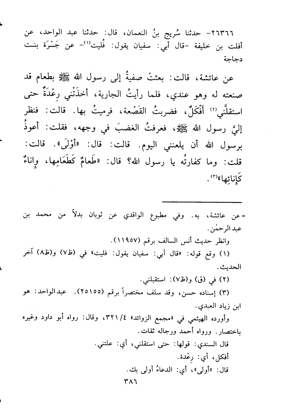 ٢٦٣٦٦ - حَدَّثَنَا سُرَيْجُ بْنُ النُّعْمَانِ، قَالَ: حَدَّثَنَا عَبْدُ الْوَاحِدِ، عَنْ أَفْلَتَ بْنِ خَلِيفَةَ، قَالَ أَبِي: سُفْيَانُ يَقُولُ: فُلَيْتٌ، (١) عَنْ جَسْرَةَ بِنْتِ دَجَاجَةَ، عَنْ عَائِشَةَ، قَالَتْ: بَعَثَتْ صَفِيَّةُ إِلَى رَسُولِ اللهِ صَلَّى اللهُ عَلَيْهِ وَسَلَّمَ بِطَعَامٍ قَدْ صَنَعَتْهُ لَهُ وَهُوَ عِنْدِي، فَلَمَّا رَأَيْتُ الْجَارِيَةَ، أَخَذَتْنِي رِعْدَةٌ حَتَّى اسْتَقَلَّنِي (٢) أَفْكَلُ، فَضَرَبْتُ الْقَصْعَةَ، فَرَمَيْتُ بِهَا. قَالَتْ: فَنَظَرَ إِلَيَّ رَسُولُ اللهِ صَلَّى اللهُ عَلَيْهِ وَسَلَّمَ، فَعَرَفْتُ الْغَضَبَ فِي وَجْهِهِ، فَقُلْتُ: أَعُوذُ بِرَسُولِ اللهِ أَنْ يَلْعَنَنِي الْيَوْمَ. قَالَتْ: قَالَ: " أَوْلَى ". قَالَتْ: قُلْتُ: وَمَا كَفَّارَتُهُ يَا رَسُولَ اللهِ؟ قَالَ: " طَعَامٌ كَطَعَامِهَا، وَإِنَاءٌ كَإِنَائِهَا " (٣)