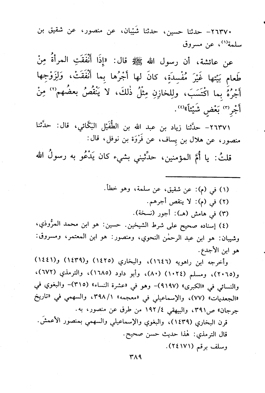 ٢٦٣٧٠ - حَدَّثَنَا حُسَيْنٌ، حَدَّثَنَا شَيْبَانُ، عَنْ مَنْصُورٍ، عَنْ شَقِيقِ بْنِ سَلَمَةَ (١) ، عَنِ مَسْرُوقٍ، عَنْ عَائِشَةَ، أَنَّ رَسُولَ اللهِ صَلَّى اللهُ عَلَيْهِ وَسَلَّمَ قَالَ: " إِذَا أَنْفَقَتِ الْمَرْأَةُ مِنْ طَعَامِ بَيْتِهَا غَيْرَ مُفْسِدَةٍ، كَانَ لَهَا أَجْرُهَا بِمَا أَنْفَقَتْ، وَلِزَوْجِهَا أَجْرُهُ بِمَا اكْتَسَبَ، وَلِلْخَازِنِ مِثْلُ ذَلِكَ، لَا يَنْقُصُ بَعْضُهُمْ (٢) مِنْ أَجْرِ (٣) بَعْضٍ شَيْئًا " (٤)