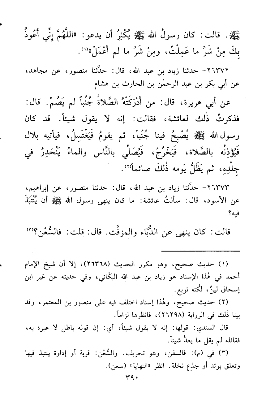 ٢٦٣٧٣ - حَدَّثَنَا زِيَادُ بْنُ عَبْدِ اللهِ، قَالَ: حَدَّثَنَا مَنْصُورٌ، عَنْ إِبْرَاهِيمَ، عَنِ الْأَسْوَدِ، قَالَ: سَأَلْتُ عَائِشَةَ مَا كَانَ يَنْهَى رَسُولُ اللهِ صَلَّى اللهُ عَلَيْهِ وَسَلَّمَ أَنْ يُنْتَبَذَ فِيهِ قَالَتْ: كَانَ " يَنْهَى عَنِ الدُّبَّاءِ وَالْمُزَفَّتِ " قَالَ: قُلْتُ: فَالسُّعْنُ؟ (٣)