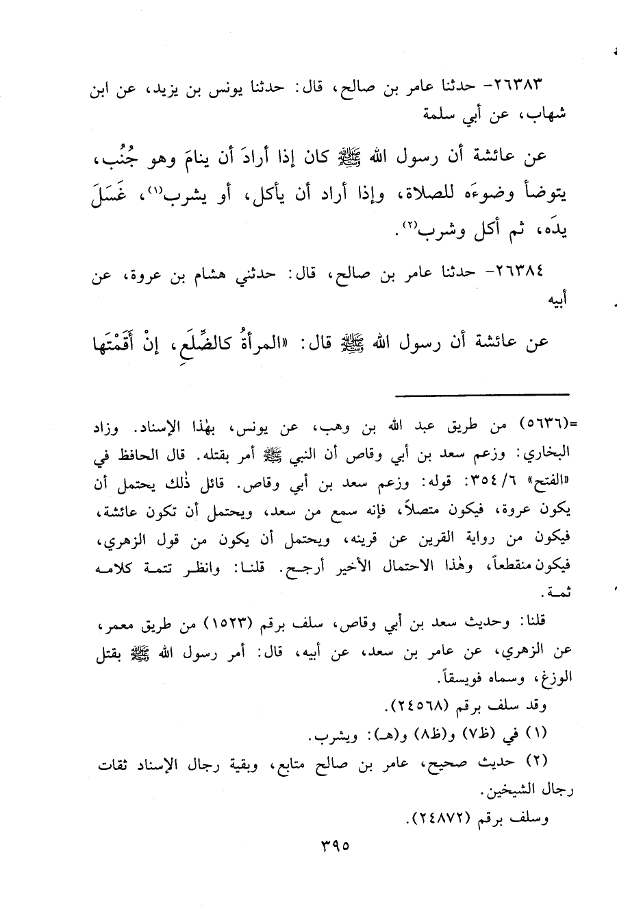 ٢٦٣٨٣ - حَدَّثَنَا عَامِرُ بْنُ صَالِحٍ، قَالَ: حَدَّثَنَا يُونُسُ بْنُ يَزِيدَ، عَنِ ابْنِ شِهَابٍ، عَنْ أَبِي سَلَمَةَ، عَنْ عَائِشَةَ، " أَنَّ رَسُولَ اللهِ صَلَّى اللهُ عَلَيْهِ وَسَلَّمَ كَانَ إِذَا أَرَادَ أَنْ يَنَامَ وَهُوَ جُنُبٌ، يَتَوَضَّأُ وُضُوءَهُ لِلصَّلَاةِ، وَإِذَا أَرَادَ أَنْ يَأْكُلَ، أَوْ يَشْرَبَ (١) ، غَسَلَ يَدَهُ، ثُمَّ أَكَلَ وَشَرِبَ " (٢)