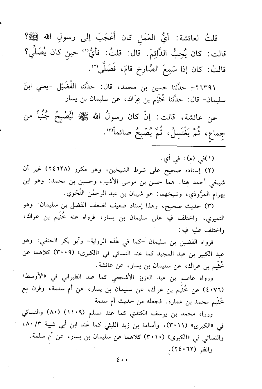 ٢٦٣٩١ - حَدَّثَنَا حُسَيْنُ بْنُ مُحَمَّدٍ، قَالَ: حَدَّثَنَا الْفُضَيْلُ يَعْنِي ابْنَ سُلَيْمَانَ، قَالَ: حَدَّثَنَا خُثَيْمُ بْنُ عِرَاكٍ، عَنْ سُلَيْمَانَ بْنِ يَسَارٍ، عَنْ عَائِشَةَ، قَالَتْ: " إِنْ كَانَ رَسُولُ اللهِ صَلَّى اللهُ عَلَيْهِ وَسَلَّمَ لَيُصْبِحُ جُنُبًا مِنْ جِمَاعٍ ثُمَّ يَغْتَسِلُ، ثُمَّ يُصْبِحُ صَائِمًا " (٣)
