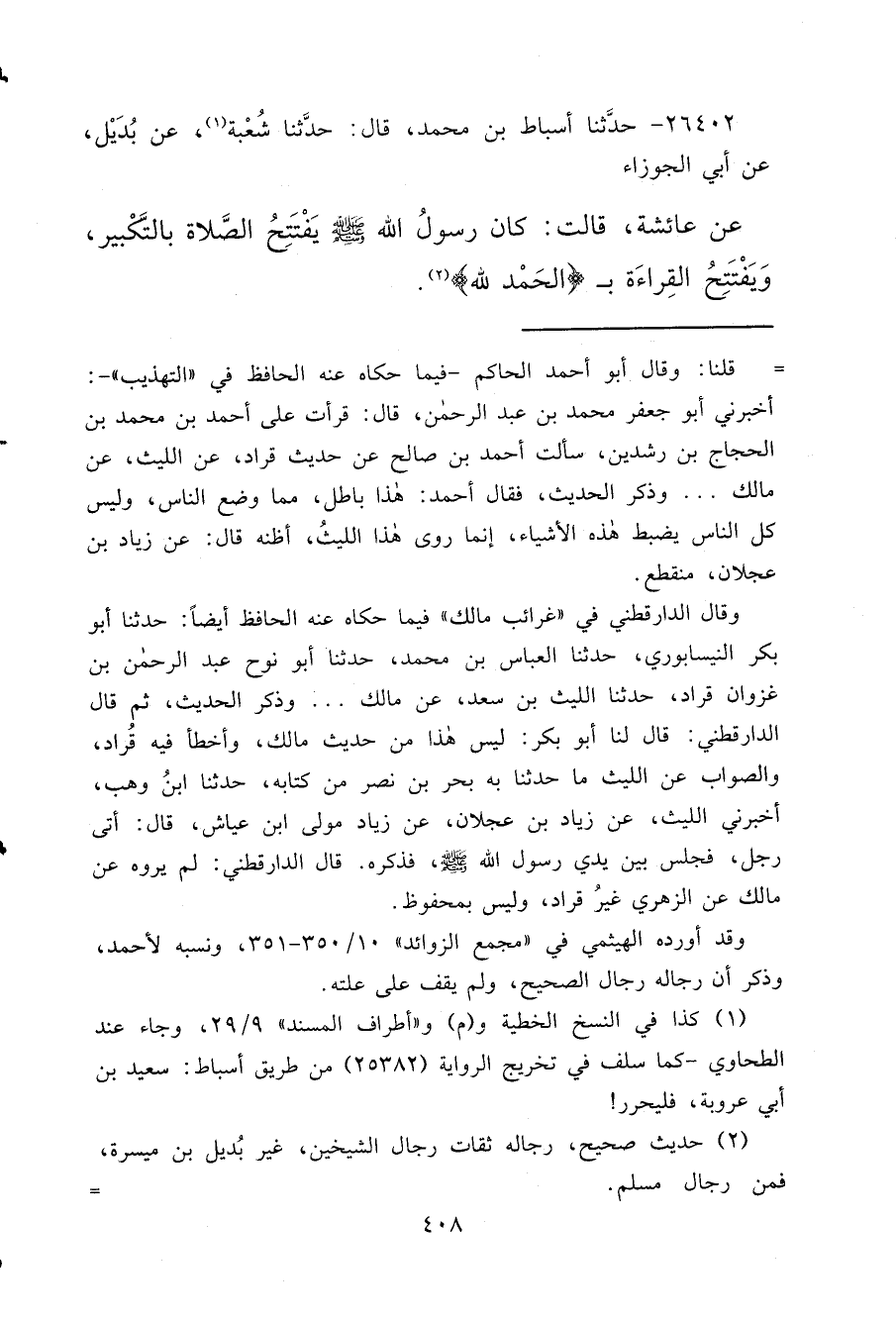 ٢٦٤٠٢ - حَدَّثَنَا أَسْبَاطُ بْنُ مُحَمَّدٍ، قَالَ: حَدَّثَنَا شُعْبَةُ، (١) عَنْ بُدَيْلٍ، عَنْ أَبِي الْجَوْزَاءِ، عَنْ عَائِشَةَ، قَالَتْ: " كَانَ رَسُولُ اللهِ صَلَّى اللهُ عَلَيْهِ وَسَلَّمَ يَفْتَتِحُ الصَّلَاةَ بِالتَّكْبِيرِ، وَيَفْتَتِحُ الْقِرَاءَةَ بِالْحَمْدُ لِلَّهِ " (٢)