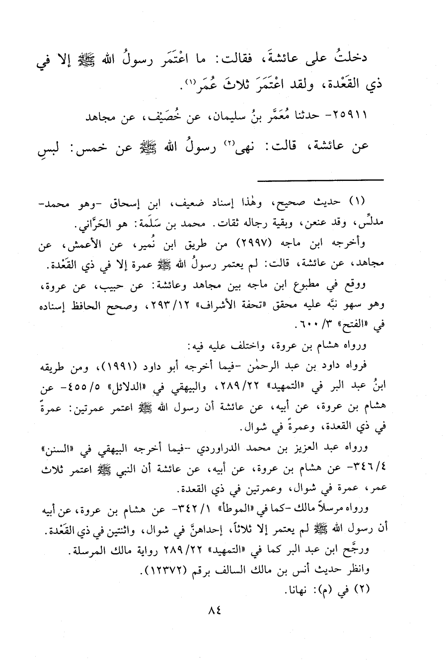 ورواه مرسلاً مالك- كما في "الموطأ" ١/٣٤٢- عن هشام بن عروة، عن أبيه أن رسول الله صَلَّى اللهُ عَلَيْهِ وَسَلَّمَ لم يعتمر إلا ثلاثاً، إحداهنَّ في شوال، واثنتين في ذي القَعْدة.
