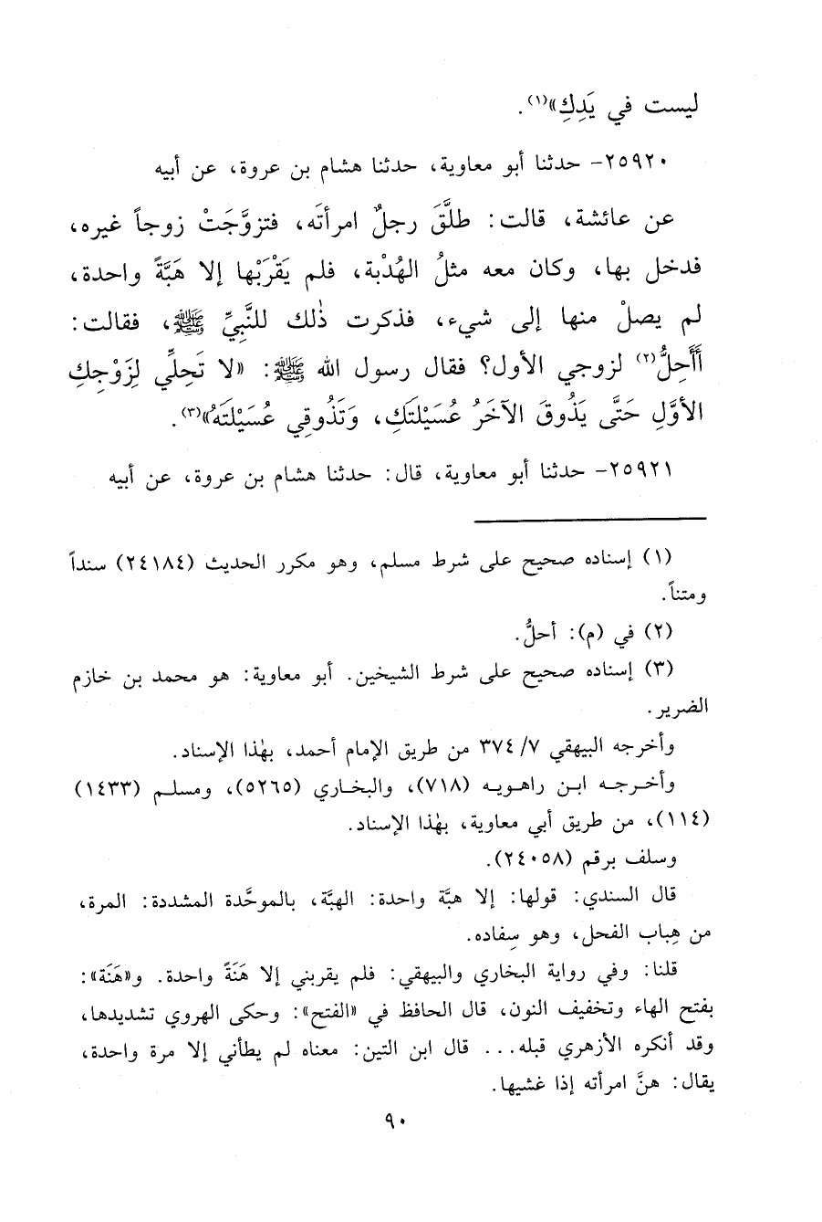 ٢٥٩٢٠ - حَدَّثَنَا أَبُو مُعَاوِيَةَ، حَدَّثَنَا هِشَامُ بْنُ عُرْوَةَ، عَنْ أَبِيهِ، عَنْ عَائِشَةَ، قَالَتْ: " طَلَّقَ رَجُلٌ امْرَأَتَهُ، فَتَزَوَّجَتْ زَوْجًا غَيْرَهُ، فَدَخَلَ بِهَا وَكَانَ مَعَهُ مِثْلُ الْهُدْبَةِ، فَلَمْ يَقْرَبْهَا إِلَّا هَبَّةً وَاحِدَةً لَمْ يَصِلْ مِنْهَا إِلَى شَيْءٍ، فَذَكَرَتْ ذَلِكَ لِلنَّبِيِّ صَلَّى اللهُ عَلَيْهِ وَسَلَّمَ، فَقَالَتْ: أَأَحِلُّ (٢) لِزَوْجِي الْأَوَّلِ؟ فَقَالَ رَسُولُ اللهِ صَلَّى اللهُ عَلَيْهِ وَسَلَّمَ: " لَا تَحِلِّي لِزَوْجِكِ الْأَوَّلِ حَتَّى يَذُوقَ الْآخَرُ عُسَيْلَتَكِ وَتَذُوقِي عُسَيْلَتَهُ " (٣)