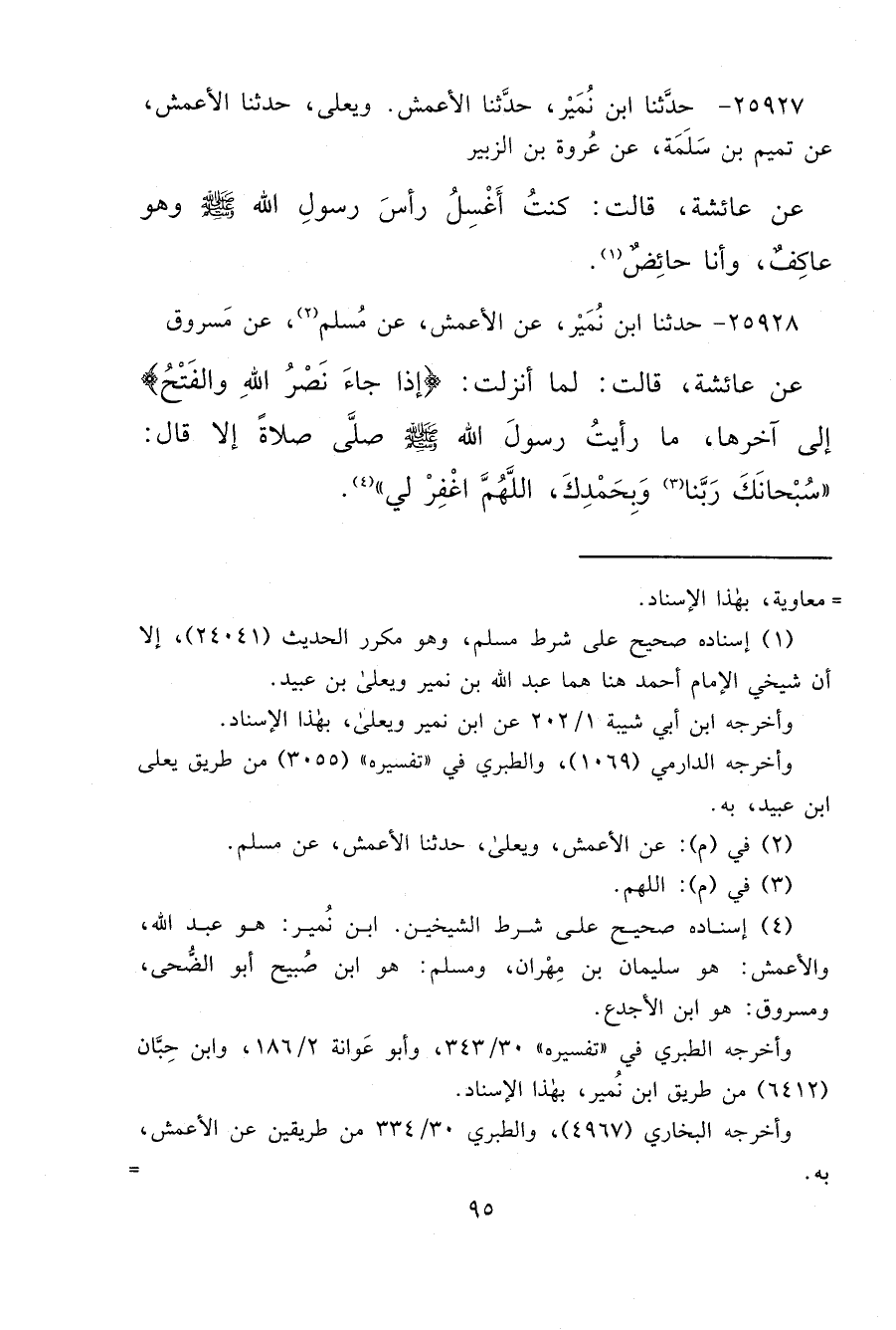 (٤) إسناد ٥صحيح على شرط الشيخين. ابن نُمير: هو عبد الله، والأعمش: هو سليمان بن مِهْران، ومسلم: هو ابن صُبيح أبو الضُّحى، ومسروق: هو ابن الأجدع.