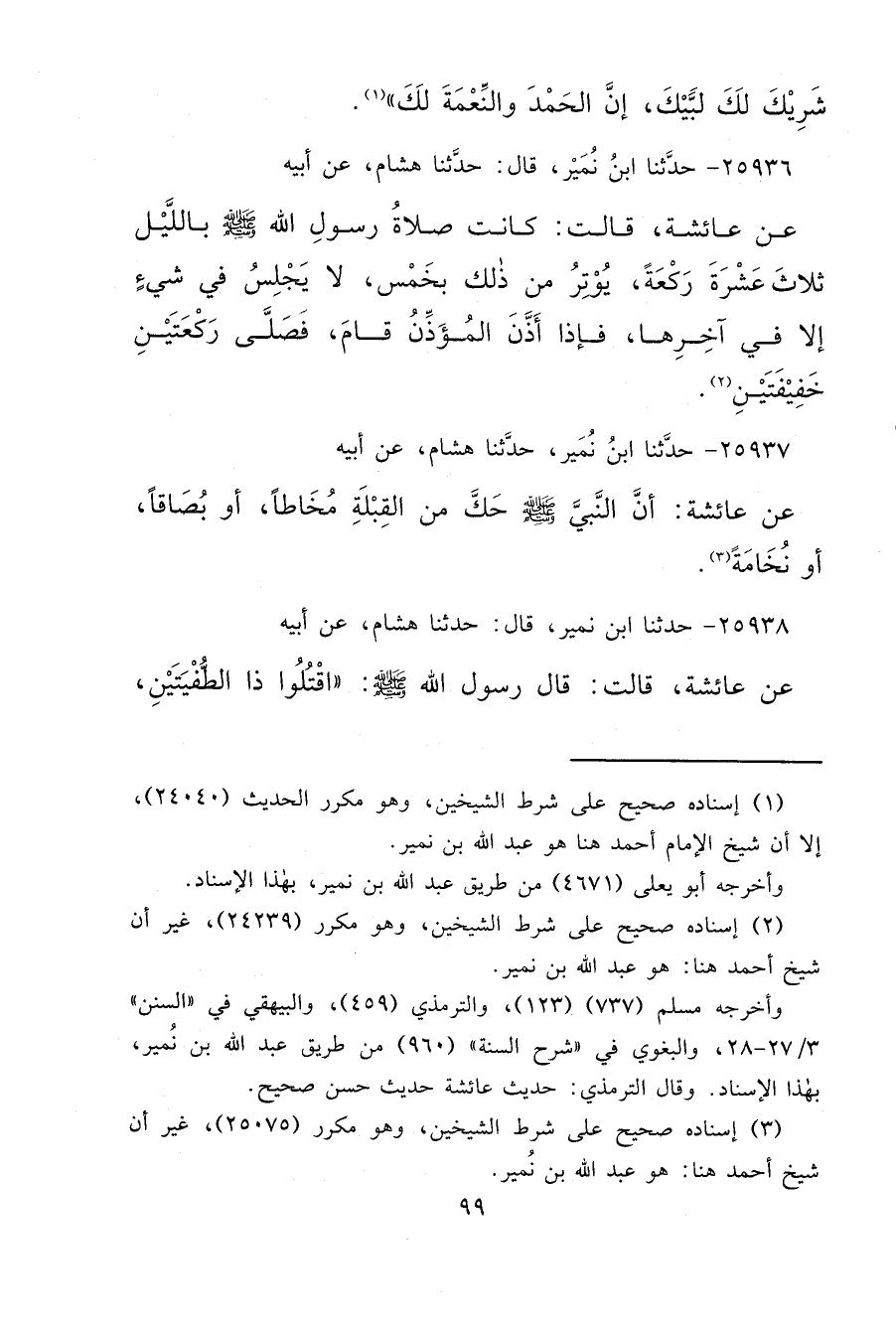 ٢٥٩٣٨ - حَدَّثَنَا ابْنُ نُمَيْرٍ، قَالَ: حَدَّثَنَا هِشَامٌ، عَنْ أَبِيهِ، عَنْ عَائِشَةَ، قَالَتْ قَالَ رَسُولُ اللهِ صَلَّى اللهُ عَلَيْهِ وَسَلَّمَ: " اقْتُلُوا ذَا الطُّفْيَتَيْنِ،