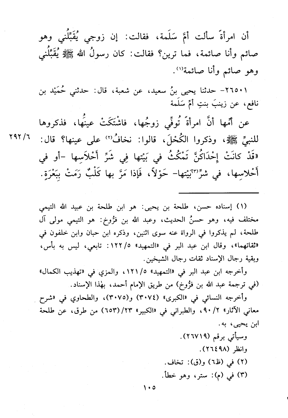 ٢٦٥٠١ - حَدَّثَنَا يَحْيَى بْنُ سَعِيدٍ، عَنْ شُعْبَةَ قَالَ: حَدَّثَنِي حُمَيْدُ بْنُ نَافِعٍ، عَنْ زَيْنَبَ بِنْتِ أُمِّ سَلَمَةَ، عَنْ أُمِّهَا، أَنَّ امْرَأَةً تُوُفِّيَ زَوْجُهَا فَاشْتَكَتْ عَيْنَهَا فَذَكَرُوهَا لِلنَّبِيِّ صَلَّى اللهُ عَلَيْهِ وَسَلَّمَ وَذَكَرُوا الْكُحْلَ، قَالُوا: نَخَافُ (٢) عَلَى عَيْنِهَا؟ قَالَ: " قَدْ كَانَتْ إِحْدَاكُنَّ تَمْكُثُ فِي بَيْتِهَا فِي شَرِّ أَحْلَاسِهَا، أَوْ فِي أَحْلَاسِهَا فِي شَرِّ (٣) بَيْتِهَا حَوْلًا، فَإِذَا مَرَّ بِهَا كَلْبٌ رَمَتْ بِبَعْرَةٍ.