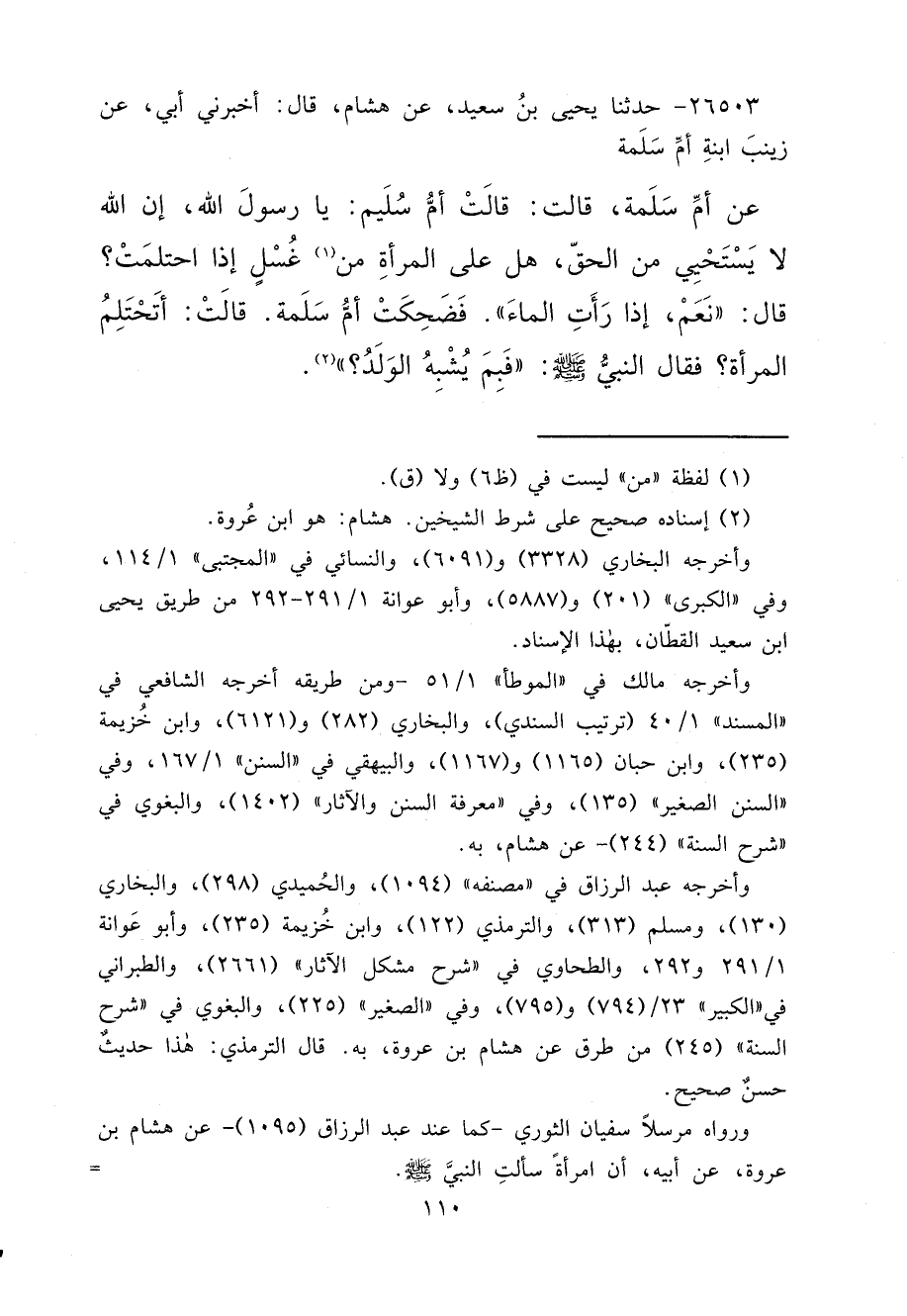 ٢٦٥٠٣ - حَدَّثَنَا يَحْيَى بْنُ سَعِيدٍ، عَنْ هِشَامٍ، قَالَ: أَخْبَرَنِي أَبِي، عَنْ زَيْنَبَ ابْنَةِ أُمِّ سَلَمَةَ، عَنْ أُمِّ سَلَمَةَ، قَالَتْ: قَالَتْ أُمُّ سُلَيْمٍ يَا رَسُولَ اللهِ إِنَّ اللهَ لَا يَسْتَحْيِي مِنَ الْحَقِّ، هَلْ عَلَى الْمَرْأَةِ مِنْ (١) غُسْلٍ إِذَا احْتَلَمَتْ؟ قَالَ: " نَعَمْ، إِذَا رَأَتِ الْمَاءَ " فَضَحِكَتْ أُمُّ سَلَمَةَ. قَالَتْ: أَتَحْتَلِمُ الْمَرْأَةُ؟ فَقَالَ النَّبِيُّ صَلَّى اللهُ عَلَيْهِ وَسَلَّمَ: " فَبِمَ يُشْبِهُ الْوَلَدُ؟ " (٢)