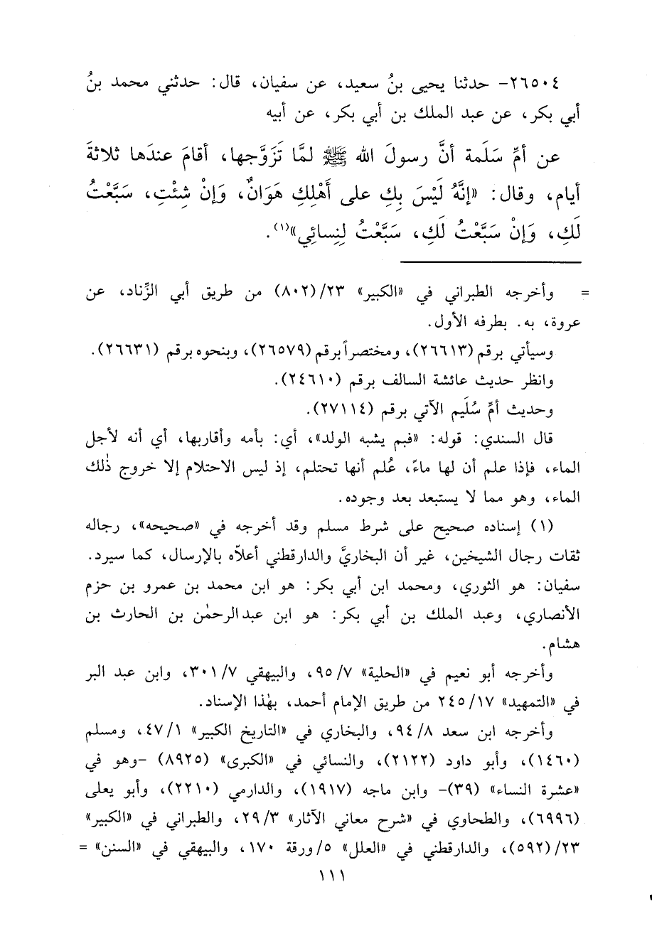٢٦٥٠٤ - حَدَّثَنَا يَحْيَى بْنُ سَعِيدٍ، عَنْ سُفْيَانَ، قَالَ: حَدَّثَنِي مُحَمَّدُ بْنُ أَبِي بَكْرٍ، عَنْ عَبْدِ الْمَلِكِ بْنِ أَبِي بَكْرٍ، عَنْ أَبِيهِ، عَنْ أُمِّ سَلَمَةَ، أَنَّ رَسُولَ اللهِ صَلَّى اللهُ عَلَيْهِ وَسَلَّمَ لَمَّا تَزَوَّجَهَا أَقَامَ عِنْدَهَا ثَلَاثَةَ أَيَّامٍ وَقَالَ: " إِنَّهُ لَيْسَ بِكِ عَلَى أَهْلِكِ هَوَانٌ، وَإِنْ شِئْتِ، سَبَّعْتُ لَكِ وَإِنْ سَبَّعْتُ لَكِ، سَبَّعْتُ لِنِسَائِي " (١)