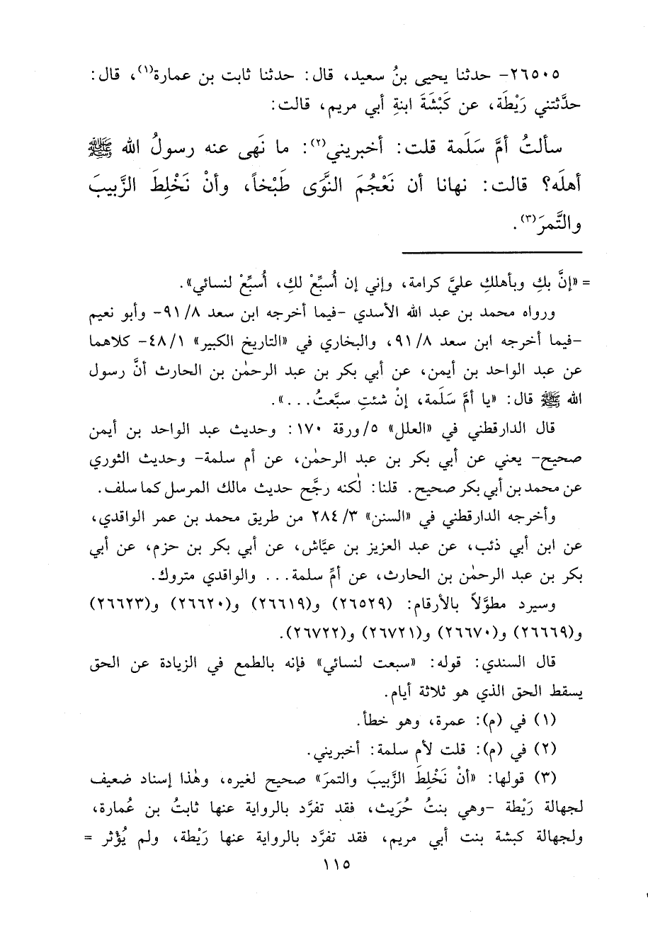 ٢٦٥٠٥ - حَدَّثَنَا يَحْيَى بْنُ سَعِيدٍ، قَالَ: حَدَّثَنَا ثَابِتُ بْنُ عُمَارَةَ (١) ، قَالَ: حَدَّثَتْنِي رَيْطَةُ، عَنْ كَبْشَةَ ابْنَةِ أَبِي مَرْيَمَ، قَالَتْ: سَأَلْتُ أُمَّ سَلَمَةَ قُلْتُ: أَخْبِرِينِي (٢) مَا نَهَى عَنْهُ رَسُولُ اللهِ صَلَّى اللهُ عَلَيْهِ وَسَلَّمَ أَهْلَهُ؟ قَالَتْ: " نَهَانَا أَنْ نَعْجُمَ النَّوَى طَبْخًا، وَأَنْ نَخْلِطَ الزَّبِيبَ وَالتَّمْرَ " (٣)