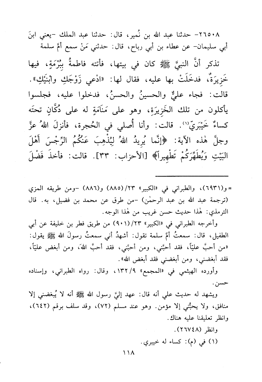 ٢٦٥٠٨ - حَدَّثَنَا عَبْدُ اللهِ بْنُ نُمَيْرٍ، قَالَ: حَدَّثَنَا عَبْدُ الْمَلِكِ يَعْنِي ابْنَ أَبِي سُلَيْمَانَ، عَنْ عَطَاءِ بْنِ أَبِي رَبَاحٍ، قَالَ: حَدَّثَنِي مَنْ سَمِعَ أُمَّ سَلَمَةَ، تَذْكُرُ أَنَّ النَّبِيَّ صَلَّى اللهُ عَلَيْهِ وَسَلَّمَ كَانَ فِي بَيْتِهَا، فَأَتَتْهُ فَاطِمَةُ بِبُرْمَةٍ، فِيهَا خَزِيرَةٌ، فَدَخَلَتْ بِهَا عَلَيْهِ، فَقَالَ لَهَا: " ادْعِي زَوْجَكِ وَابْنَيْكِ " قَالَتْ: فَجَاءَ عَلِيٌّ، وَالْحُسَيْنُ، وَالْحَسَنُ، فَدَخَلُوا عَلَيْهِ، فَجَلَسُوا يَأْكُلُونَ مِنْ تِلْكَ الْخَزِيرَةِ، وَهُوَ عَلَى مَنَامَةٍ لَهُ عَلَى دُكَّانٍ تَحْتَهُ كِسَاءٌ خَيْبَرِيٌّ (١) . قَالَتْ: وَأَنَا أُصَلِّي فِي الْحُجْرَةِ، فَأَنْزَلَ اللهُ عَزَّ وَجَلَّ هَذِهِ الْآيَةَ: {إِنَّمَا يُرِيدُ اللهُ لِيُذْهِبَ عَنْكُمُ الرِّجْسَ أَهْلَ الْبَيْتِ وَيُطَهِّرَكُمْ تَطْهِيرًا} [الأحزاب: ٣٣] قَالَتْ: فَأَخَذَ فَضْلَ