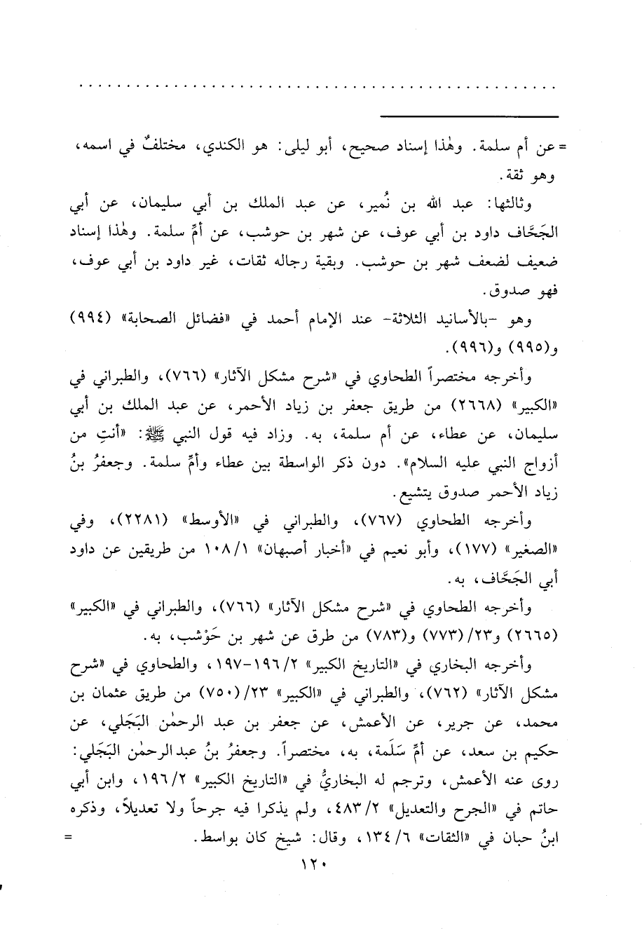 وثالثها: عبد الله بن نُمير، عن عبد الملك بن أبي سليمان، عن أبي الجَحَّاف داود بن أبي عوف، عن شهر بن حوشب، عن أمِّ سلمة. وهذا إسناد ضعيف لضعف شهر بن حوشب. وبقية رجاله ثقات، غير داود بن أبي عوف، فهو صدوق.