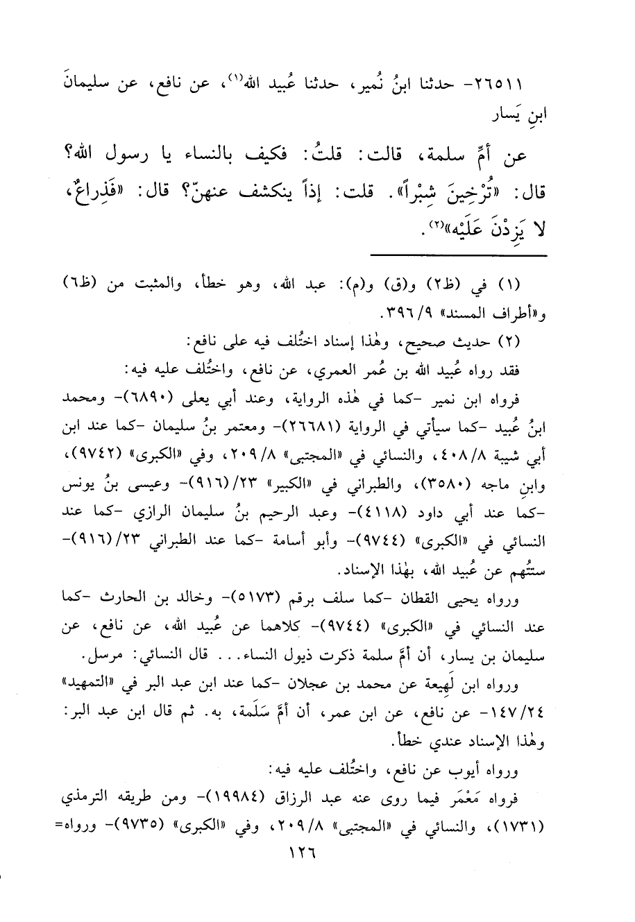 ٢٦٥١١ - حَدَّثَنَا ابْنُ نُمَيْرٍ، حَدَّثَنَا عُبَيْدُ اللهِ (١) ، عَنْ نَافِعٍ، عَنْ سُلَيْمَانَ بْنِ يَسَارٍ، عَنْ أُمِّ سَلَمَةَ، قَالَتْ: قُلْتُ: فَكَيْفَ بِالنِّسَاءِ يَا رَسُولَ اللهِ؟ قَالَ: " تُرْخِينَ شِبْرًا " قُلْتُ: إِذَنْ يَنْكَشِفَ عَنْهُنَّ؟ قَالَ: " فَذِرَاعٌ لَا يَزِدْنَ عَلَيْهِ " (٢)