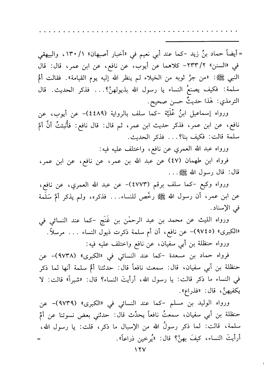 = أيضاً حماد بنُ زيد - كما عند أبي نعيم في "أخبار أصبهان" ١/١٣٠، والبيهقي في "السنن" ٢/٢٣٣- كلاهما عن أيوب، عن نافع، عن ابن عمر، قال: قال النبي صَلَّى اللهُ عَلَيْهِ وَسَلَّمَ: "من جرَّ ثوبه من الخيلاء لم ينظر الله إليه يوم القيامة". فقالت أمُّ سلمة: فكيف يصنعُ النساء يا رسول الله بذيولهنَّ؟ ... فذكر الحديث. قال الترمذي: هذا حديث حسن صحيح.