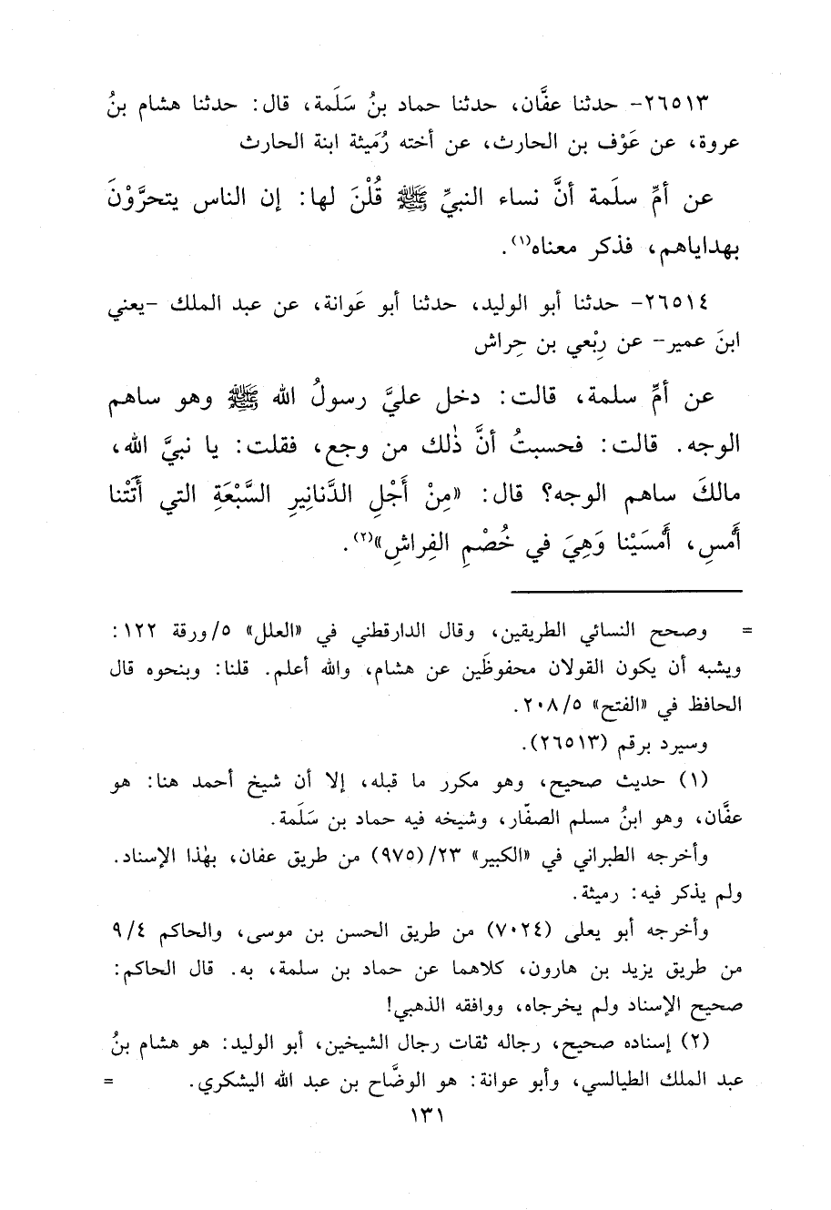 ٢٦٥١٤ - حَدَّثَنَا أَبُو الْوَلِيدِ، حَدَّثَنَا أَبُو عَوَانَةَ، عَنْ عَبْدِ الْمَلِكِ يَعْنِي ابْنَ عُمَيْرٍ، عَنْ رِبْعِيِّ بْنِ حِرَاشٍ، عَنْ أُمِّ سَلَمَةَ، قَالَتْ: دَخَلَ عَلَيَّ رَسُولُ اللهِ صَلَّى اللهُ عَلَيْهِ وَسَلَّمَ وَهُوَ سَاهِمُ الْوَجْهِ. قَالَتْ: فَحَسِبْتُ أَنَّ ذَلِكَ مِنْ وَجَعٍ، فَقُلْتُ: يَا نَبِيَّ اللهِ، مَا لَكَ سَاهِمُ الْوَجْهِ؟ قَالَ: " مِنْ أَجْلِ الدَّنَانِيرِ السَّبْعَةِ الَّتِي أَتَتْنَا أَمْسِ، أَمْسَيْنَا وَهِيَ فِي خُصْمِ الْفِرَاشِ " (٢)