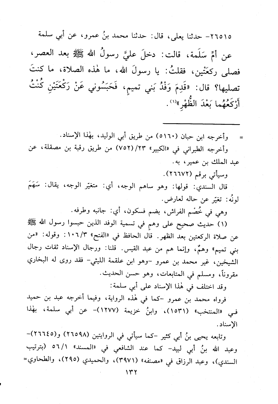 ٢٦٥١٥ - حَدَّثَنَا يَعْلَى، قَالَ: حَدَّثَنَا مُحَمَّدُ بْنُ عَمْرٍو، عَنْ أَبِي سَلَمَةَ، عَنْ أُمِّ سَلَمَةَ، قَالَتْ: دَخَلَ عَلَيَّ رَسُولُ اللهِ صَلَّى اللهُ عَلَيْهِ وَسَلَّمَ بَعْدَ الْعَصْرِ، فَصَلَّى رَكْعَتَيْنِ، فَقُلْتُ يَا رَسُولَ اللهِ، مَا هَذِهِ الصَّلَاةُ، مَا كُنْتَ تُصَلِّيهَا؟ قَالَ: " قَدِمَ وَفْدُ بَنِي تَمِيمٍ، فَحَبَسُونِي عَنْ رَكْعَتَيْنِ كُنْتُ أَرْكَعُهُمَا بَعْدَ الظُّهْرِ " (١)