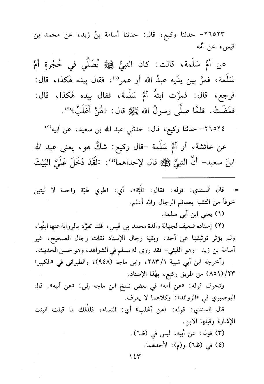 ٢٦٥٢٣ - حَدَّثَنَا وَكِيعٌ، قَالَ: حَدَّثَنَا أُسَامَةُ بْنُ زَيْدٍ، عَنْ مُحَمَّدِ بْنِ قَيْسٍ، عَنْ أُمِّهِ، عَنْ أُمِّ سَلَمَةَ، قَالَتْ: كَانَ النَّبِيُّ صَلَّى اللهُ عَلَيْهِ وَسَلَّمَ يُصَلِّي فِي حُجْرَةِ أُمِّ سَلَمَةَ، فَمَرَّ بَيْنَ يَدَيْهِ عَبْدُ اللهِ أَوْ عُمَرُ (١) ، فَقَالَ: بِيَدِهِ هَكَذَا، قَالَ: فَرَجَعَ، قَالَ: فَمَرَّتْ ابْنَةُ أُمِّ سَلَمَةَ، فَقَالَ بِيَدِهِ هَكَذَا، قَالَ: فَمَضَتْ فَلَمَّا صَلَّى رَسُولُ اللهِ صَلَّى اللهُ عَلَيْهِ وَسَلَّمَ قَالَ: " هُنَّ أَغْلَبُ " (٢)
