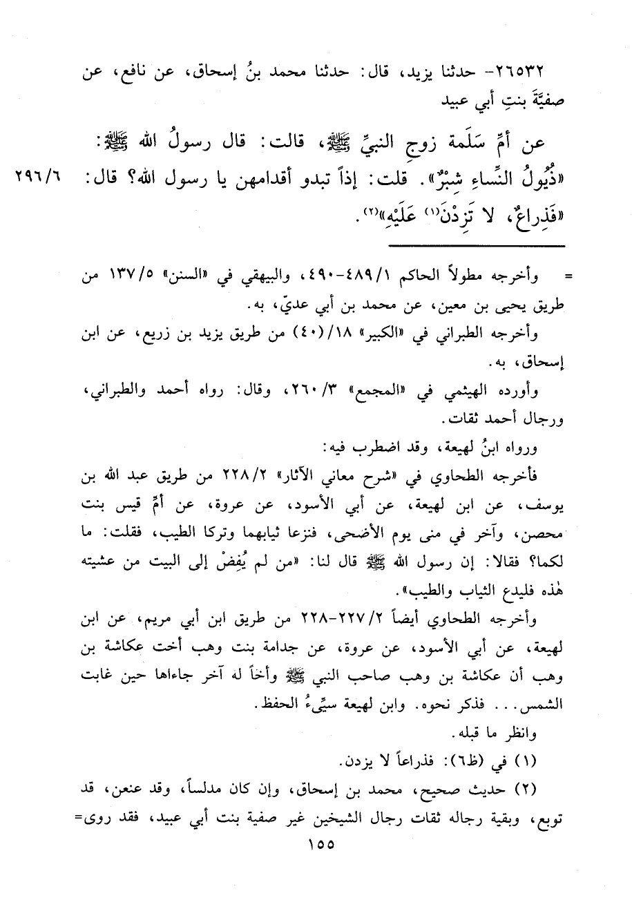 ٢٦٥٣٢ - حَدَّثَنَا يَزِيدُ، قَالَ: حَدَّثَنَا مُحَمَّدُ بْنُ إِسْحَاقَ، عَنْ نَافِعٍ، عَنْ صَفِيَّةَ بِنْتِ أَبِي عُبَيْدٍ، عَنْ أُمِّ سَلَمَةَ، زَوْجِ النَّبِيِّ صَلَّى اللهُ عَلَيْهِ وَسَلَّمَ قَالَتْ: قَالَ رَسُولُ اللهِ صَلَّى اللهُ عَلَيْهِ وَسَلَّمَ: " ذُيُولُ النِّسَاءِ شِبْرٌ " قُلْتُ: إِذَنْ تَبْدُوَ أَقْدَامُهُنَّ يَا رَسُولَ اللهِ؟ قَالَ: " فَذِرَاعٌ لَا تَزِدْنَ (١) عَلَيْهِ " (٢)