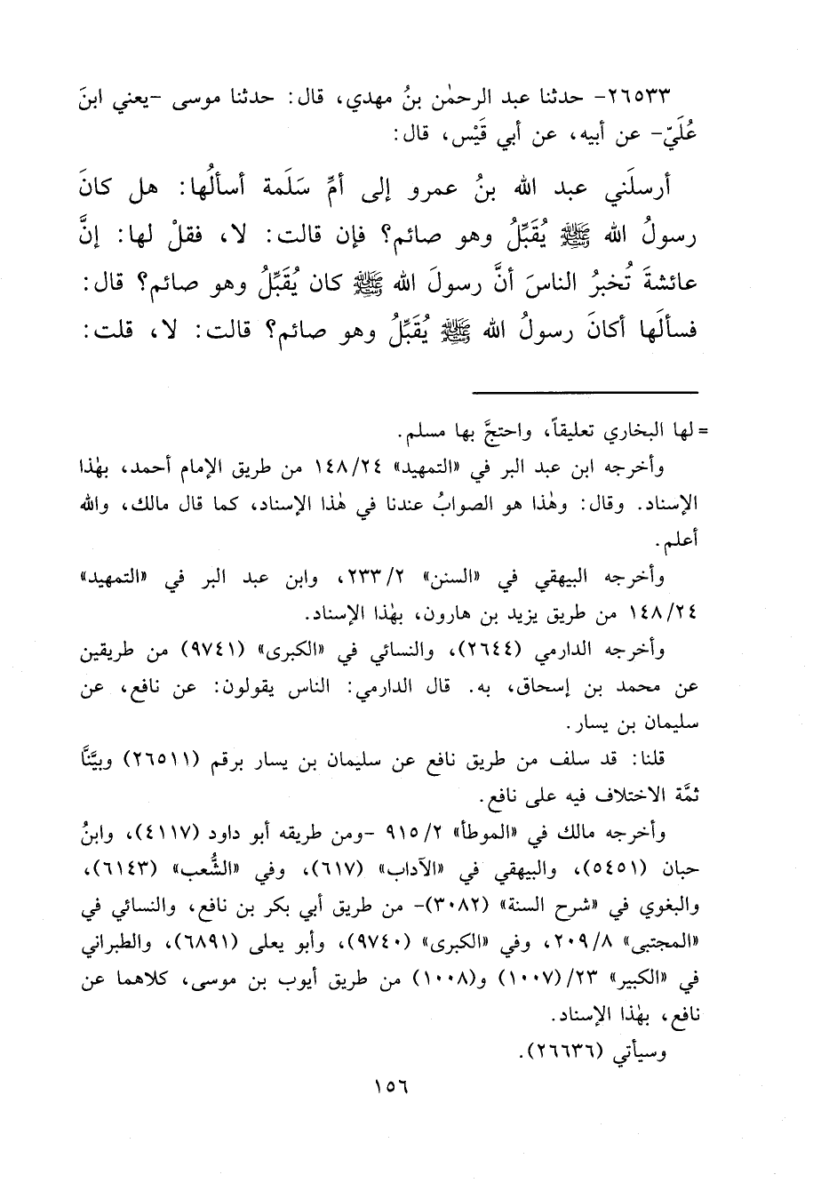 ٢٦٥٣٣ - حَدَّثَنَا عَبْدُ الرَّحْمَنِ بْنُ مَهْدِيٍّ، قَالَ: حَدَّثَنَا مُوسَى يَعْنِي ابْنَ عَلِيٍّ، عَنْ أَبِيهِ، عَنْ أَبِي قَيْسٍ، قَالَ: أَرْسَلَنِي عَبْدُ اللهِ بْنُ عَمْرٍو إِلَى أُمِّ سَلَمَةَ أَسْأَلُهَا هَلْ كَانَ رَسُولُ اللهِ صَلَّى اللهُ عَلَيْهِ وَسَلَّمَ يُقَبِّلُ وَهُوَ صَائِمٌ؟ فَإِنْ قَالَتْ: لَا، فَقُلْ لَهَا: إِنَّ عَائِشَةَ تُخْبِرُ النَّاسَ " أَنَّ رَسُولَ اللهِ صَلَّى اللهُ عَلَيْهِ وَسَلَّمَ كَانَ يُقَبِّلُ وَهُوَ صَائِمٌ؟ " قَالَ: فَسَأَلَهَا أَكَانَ رَسُولُ اللهِ صَلَّى اللهُ عَلَيْهِ وَسَلَّمَ يُقَبِّلُ وَهُوَ صَائِمٌ؟ قَالَتْ: لَا، قُلْتُ: