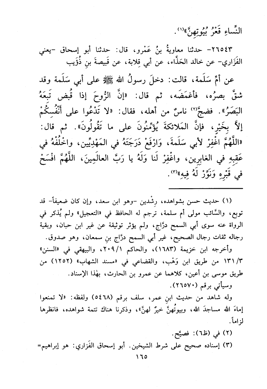 ٢٦٥٤٣ - حَدَّثَنَا مُعَاوِيَةُ بْنُ عَمْرٍو، قَالَ: حَدَّثَنَا أَبُو إِسْحَاقَ يَعْنِي الْفَزَارِيَّ، عَنْ خَالِدٍ الْحَذَّاءِ، عَنْ أَبِي قِلَابَةَ، عَنْ قَبِيصَةَ بْنِ ذُؤَيْبٍ، عَنْ أُمِّ سَلَمَةَ، قَالَتْ: دَخَلَ رَسُولُ اللهِ صَلَّى اللهُ عَلَيْهِ وَسَلَّمَ عَلَى أَبِي سَلَمَةَ وَقَدْ شَقَّ بَصَرُهُ، فَأَغْمَضَهُ، ثُمَّ قَالَ: " إِنَّ الرُّوحَ إِذَا قُبِضَ تَبِعَهُ الْبَصَرُ " فَضَجَّ (٢) نَاسٌ مِنْ أَهْلِهِ، فَقَالَ: " لَا تَدْعُوا عَلَى أَنْفُسِكُمْ إِلَّا بِخَيْرٍ، فَإِنَّ الْمَلَائِكَةَ يُؤَمِّنُونَ عَلَى مَا تَقُولُونَ " ثُمَّ قَالَ: " اللهُمَّ اغْفِرْ لِأَبِي سَلَمَةَ، وَارْفَعْ دَرَجَتَهُ فِي الْمَهْدِيِّينَ، وَاخْلُفْهُ فِي عَقِبِهِ فِي الْغَابِرِينَ، وَاغْفِرْ لَنَا وَلَهُ يَا رَبَّ الْعَالَمِينَ، اللهُمَّ افْسَحْ فِي قَبْرِهِ وَنَوِّرْ لَهُ فِيهِ " (٣)