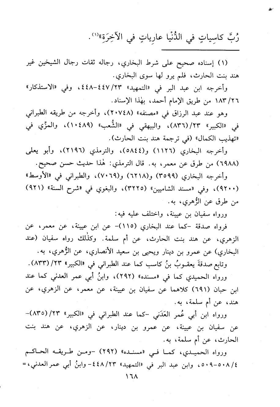 رُبَّ كَاسِيَاتٍ فِي الدُّنْيَا عَارِيَاتٍ فِي الْآخِرَةِ " (١)