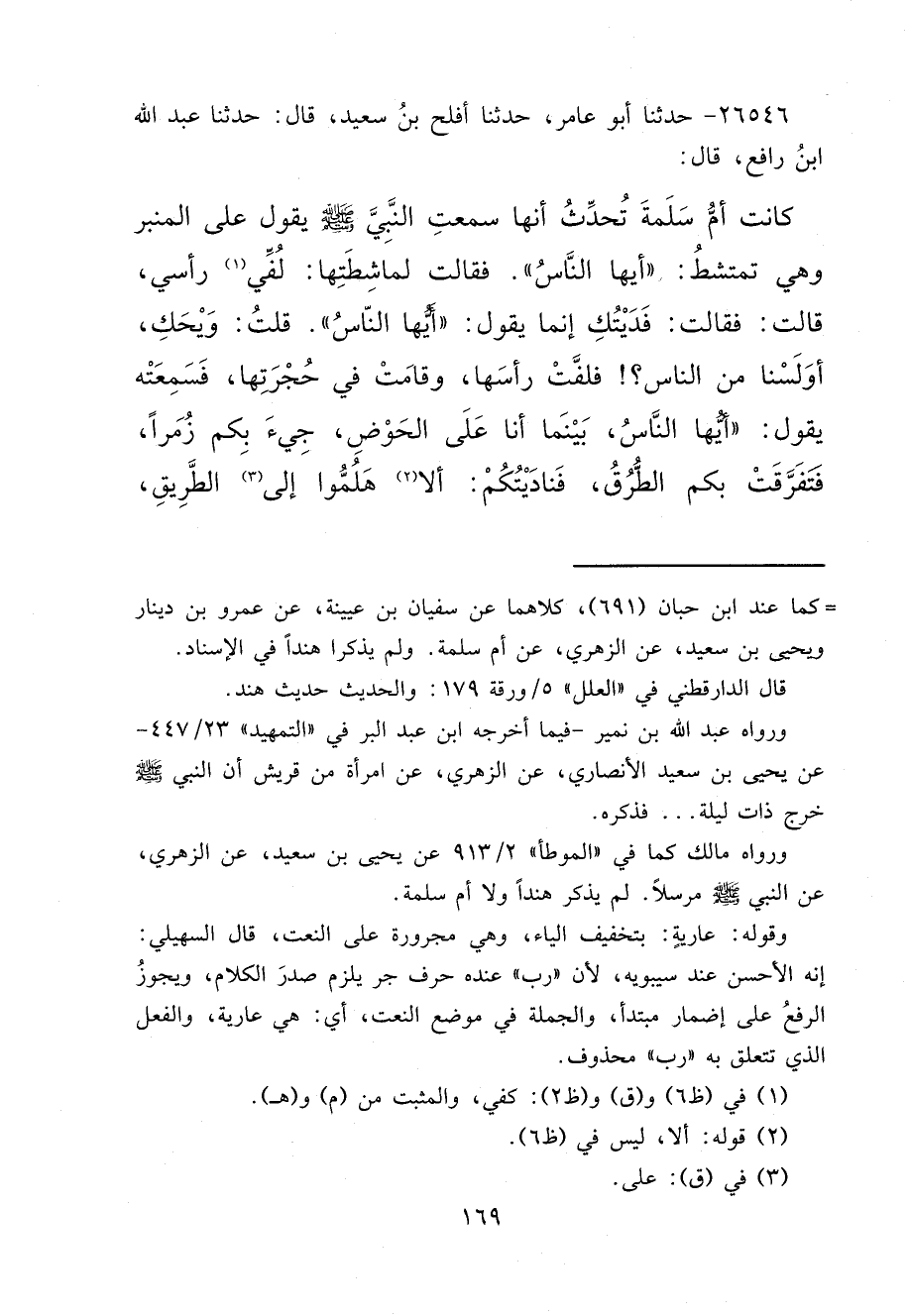 ٢٦٥٤٦ - حَدَّثَنَا أَبُو عَامِرٍ، حَدَّثَنَا أَفْلَحُ بْنُ سَعِيدٍ، قَالَ: حَدَّثَنَا عَبْدُ اللهِ بْنُ رَافِعٍ، قَالَ: كَانَتْ أُمُّ سَلَمَةَ تُحَدِّثُ أَنَّهَا سَمِعَتِ النَّبِيَّ صَلَّى اللهُ عَلَيْهِ وَسَلَّمَ يَقُولُ عَلَى الْمِنْبَرِ وَهِيَ تَمْتَشِطُ: " أَيُّهَا النَّاسُ ". فَقَالَتْ لِمَاشِطَتِهَا: لُفِّي (١) رَأْسِي، قَالَتْ: فَقَالَتْ: فَدَيْتُكِ إِنَّمَا يَقُولُ: " أَيُّهَا النَّاسُ ". قُلْتُ: وَيْحَكِ، أَوَلَسْنَا مِنَ النَّاسِ؟ فَلَفَّتْ رَأْسَهَا، وَقَامَتْ فِي حُجْرَتِهَا، فَسَمِعَتْهُ يَقُولُ: " أَيُّهَا النَّاسُ، بَيْنَمَا أَنَا عَلَى الْحَوْضِ، جِيءَ بِكُمْ زُمَرًا، فَتَفَرَّقَتْ بِكُمُ الطُّرُقُ، فَنَادَيْتُكُمْ: أَلَا (٢) هَلُمُّوا إِلَى (٣) الطَّرِيقِ،