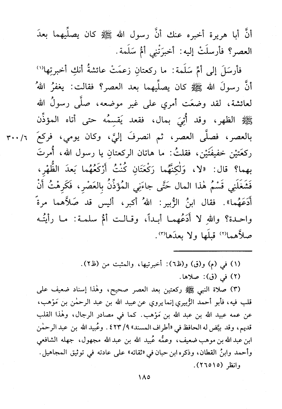 أَنَّ أَبَا هُرَيْرَةَ أَخْبَرَهُ عَنْكِ أَنَّ رَسُولَ اللهِ صَلَّى اللهُ عَلَيْهِ وَسَلَّمَ كَانَ يُصَلِّيهِمَا بَعْدَ الْعَصْرِ؟ فَأَرْسَلَتْ إِلَيْهِ: أَخْبَرَتْنِي أُمُّ سَلَمَةَ. فَأَرْسَلَ إِلَى أُمِّ سَلَمَةَ: مَا رَكْعَتَانِ زَعَمَتْ عَائِشَةُ أَنَّكِ أَخْبَرْتِهَا (١) أَنَّ رَسُولَ اللهِ صَلَّى اللهُ عَلَيْهِ وَسَلَّمَ كَانَ يُصَلِّيهِمَا بَعْدَ الْعَصْرِ؟ فَقَالَتْ: يَغْفِرُ اللهُ لِعَائِشَةَ، لَقَدْ وَضَعَتْ أَمْرِي عَلَى غَيْرِ مَوْضِعِهِ، صَلَّى رَسُولُ اللهِ صَلَّى اللهُ عَلَيْهِ وَسَلَّمَ الظُّهْرَ، وَقَدْ أُتِيَ بِمَالٍ، فَقَعَدَ يَقْسِمُهُ حَتَّى أَتَاهُ الْمُؤَذِّنُ بِالْعَصْرِ، فَصَلَّى الْعَصْرَ، ثُمَّ انْصَرَفَ إِلَيَّ، وَكَانَ يَوْمِي، فَرَكَعَ رَكْعَتَيْنِ خَفِيفَتَيْنِ، فَقُلْتُ: مَا هَاتَانِ الرَّكْعَتَانِ يَا رَسُولَ اللهِ، أُمِرْتَ بِهِمَا؟ قَالَ: " لَا، وَلَكِنَّهُمَا رَكْعَتَانِ كُنْتُ أَرْكَعُهُمَا بَعْدَ الظُّهْرِ، فَشَغَلَنِي قَسْمُ هَذَا الْمَالِ حَتَّى جَاءَنِي الْمُؤَذِّنُ بِالْعَصْرِ، فَكَرِهْتُ أَنْ أَدَعَهُمَا " فَقَالَ ابْنُ الزُّبَيْرِ: اللهُ أَكْبَرُ، أَلَيْسَ قَدْ صَلَّاهُمَا مَرَّةً وَاحِدَةً؟ وَاللهِ لَا أَدَعُهُمَا أَبَدًا، وَقَالَتْ أُمُّ سَلَمَةَ: مَا رَأَيْتُهُ صَلَّاهُمَا (٢) قَبْلَهَا وَلَا بَعْدَهَا (٣)