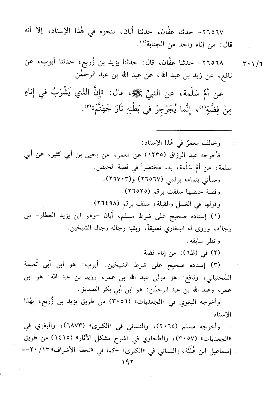 ٢٦٥٦٨ - حَدَّثَنَا عَفَّانُ، قَالَ: حَدَّثَنَا يَزِيدُ بْنُ زُرَيْعٍ، حَدَّثَنَا أَيُّوبُ، عَنْ نَافِعٍ، عَنْ زَيْدِ بْنِ عَبْدِ اللهِ، عَنْ عَبْدِ اللهِ بْنِ عَبْدِ الرَّحْمَنِ، عَنْ أُمِّ سَلَمَةَ، عَنِ النَّبِيِّ صَلَّى اللهُ عَلَيْهِ وَسَلَّمَ قَالَ: " إِنَّ الَّذِي يَشْرَبُ فِي إِنَاءٍ مِنْ فِضَّةٍ (٢) ، إِنَّمَا يُجَرْجِرُ فِي بَطْنِهِ نَارَ جَهَنَّمَ " (٣)