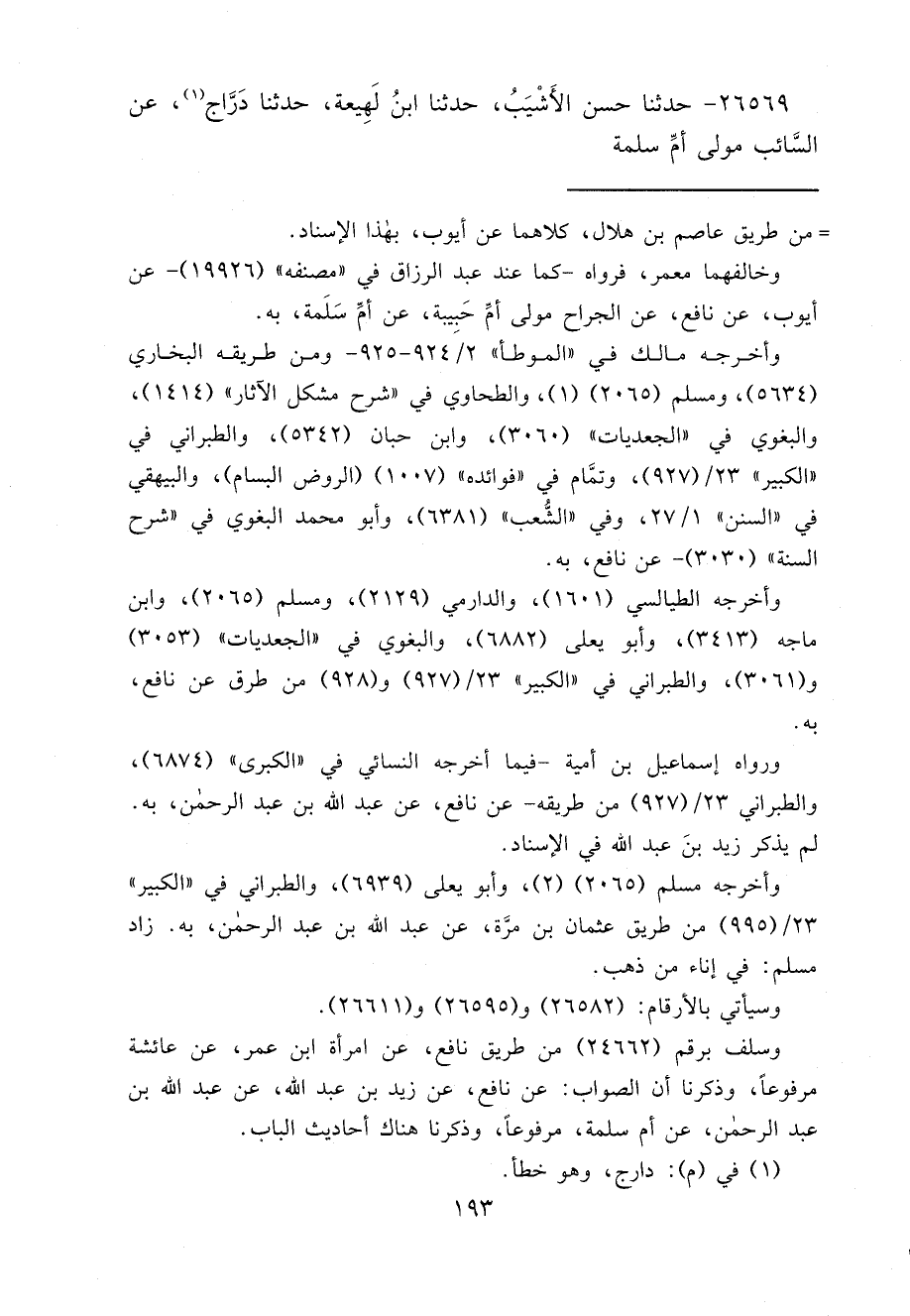 ٢٦٥٦٩ - حَدَّثَنَا حَسَنٌ الْأَشْيَبُ، حَدَّثَنَا ابْنُ لَهِيعَةَ، حَدَّثَنَا دَرَّاجٌ (١) ، عَنِ السَّائِبِ، مَوْلَى أُمِّ سَلَمَةَ،