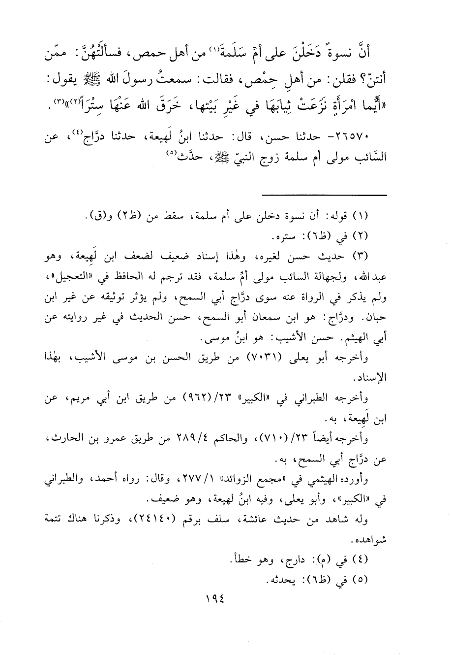 ٢٦٥٧٠ - حَدَّثَنَا حَسَنٌ، قَالَ: حَدَّثَنَا ابْنُ لَهِيعَةَ، حَدَّثَنَا دَرَّاجٌ (٤) ، عَنِ السَّائِبِ، مَوْلَى أُمِّ سَلَمَةَ زَوْجِ النَّبِيِّ صَلَّى اللهُ عَلَيْهِ وَسَلَّمَ، حَدَّثَ، (٥)