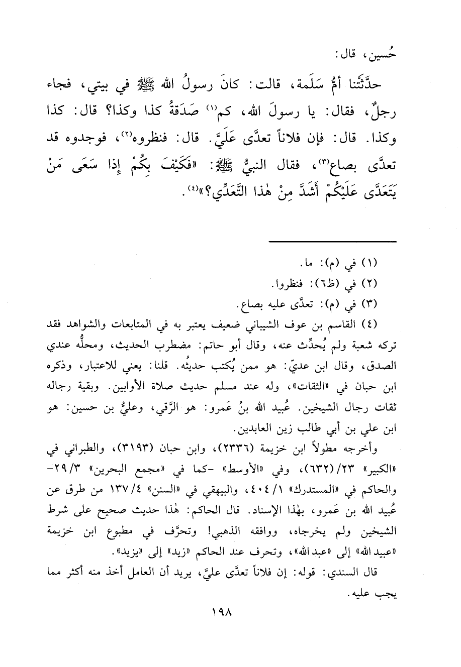 حُسَيْنٍ، قَالَ: حَدَّثَتْنَا أُمُّ سَلَمَةَ، قَالَتْ: كَانَ رَسُولُ اللهِ صَلَّى اللهُ عَلَيْهِ وَسَلَّمَ فِي بَيْتِي، فَجَاءَ رَجُلٌ، فَقَالَ: يَا رَسُولَ اللهِ، كَمْ (١) صَدَقَةُ كَذَا وَكَذَا؟ قَالَ: كَذَا وَكَذَا. قَالَ: فَإِنَّ فُلَانًا تَعَدَّى عَلَيَّ. قَالَ: فَنَظَرُوهُ (٢) ، فَوَجَدُوهُ قَدْ تَعَدَّى بِصَاعٍ (٣) ، فَقَالَ النَّبِيُّ صَلَّى اللهُ عَلَيْهِ وَسَلَّمَ: " فَكَيْفَ بِكُمْ إِذَا سَعَى مَنْ يَتَعَدَّى عَلَيْكُمْ أَشَدَّ مِنْ هَذَا التَّعَدِّي؟ " (٤)