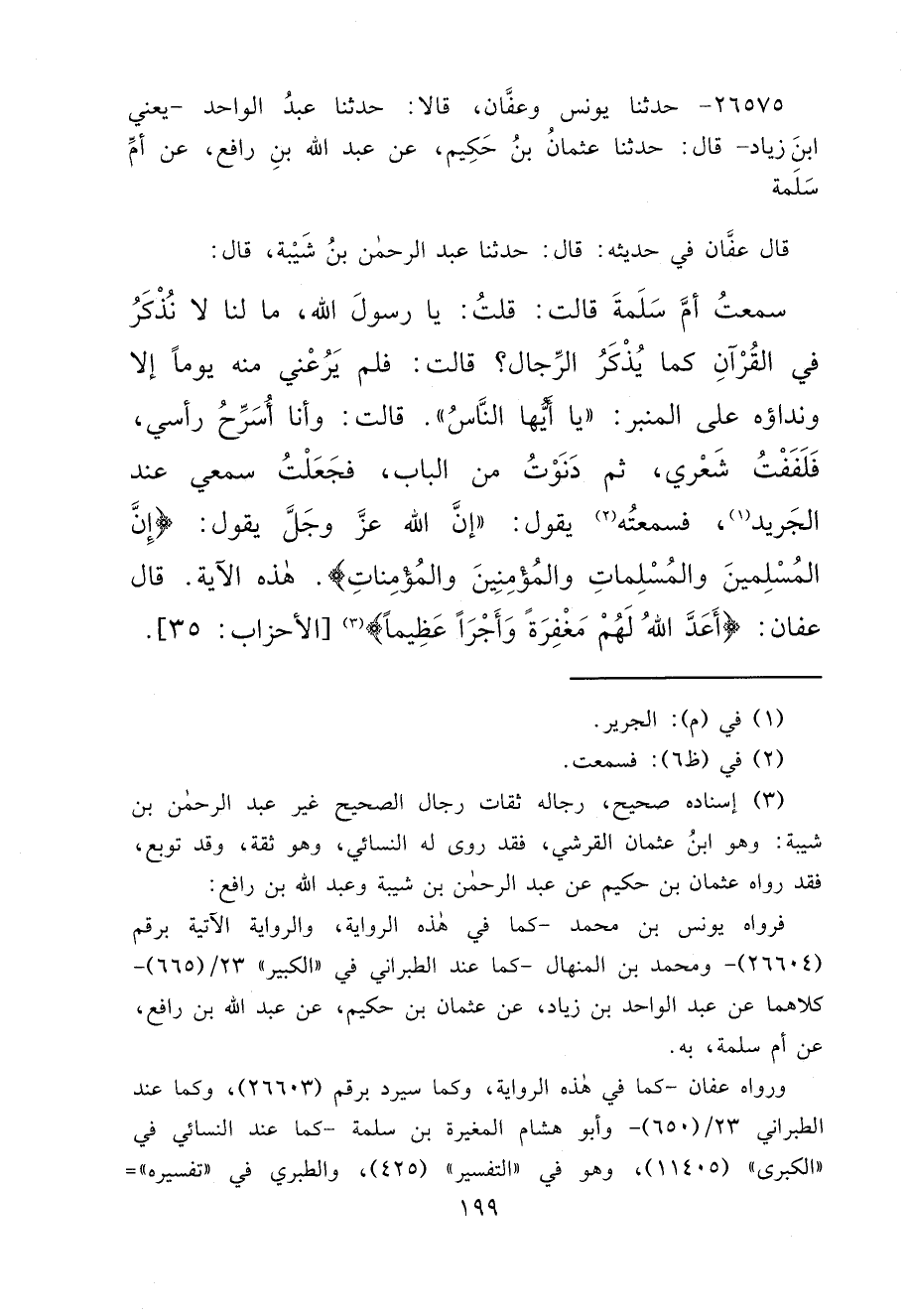 ٢٦٥٧٥ - حَدَّثَنَا يُونُسُ، وَعَفَّانُ، قَالَا: حَدَّثَنَا عَبْدُ الْوَاحِدِ يَعْنِي ابْنَ زِيَادٍ، قَالَ: حَدَّثَنَا عُثْمَانُ بْنُ حَكِيمٍ، عَنْ عَبْدِ اللهِ بْنِ رَافِعٍ، عَنْ أُمِّ سَلَمَةَ، قَالَ عَفَّانُ، فِي حَدِيثِهِ قَالَ: حَدَّثَنَا عَبْدُ الرَّحْمَنِ بْنُ شَيْبَةَ، قَالَ: سَمِعْتُ أُمَّ سَلَمَةَ، قَالَتْ: قُلْتُ: يَا رَسُولَ اللهِ مَا لَنَا لَا نُذْكَرُ فِي الْقُرْآنِ كَمَا يُذْكَرُ الرِّجَالُ؟ قَالَتْ: فَلَمْ يَرُعْنِي مِنْهُ يَوْمًا إِلَّا وَنِدَاؤُهُ عَلَى الْمِنْبَرِ: " يَا أَيُّهَا النَّاسُ ". قَالَتْ: وَأَنَا أُسَرِّحُ رَأْسِي، فَلَفَفْتُ شَعْرِي، ثُمَّ دَنَوْتُ مِنَ الْبَابِ، فَجَعَلْتُ سَمْعِي عِنْدَ الْجَرِيدِ (١) ، فَسَمِعْتُهُ (٢) يَقُولُ: " إِنَّ اللهَ عَزَّ وَجَلَّ يَقُولُ: {إِنَّ الْمُسْلِمِينَ وَالْمُسْلِمَاتِ وَالْمُؤْمِنِينَ وَالْمُؤْمِنَاتِ} [الأحزاب: ٣٥] " هَذِهِ الْآيَةَ. قَالَ عَفَّانُ: {أَعَدَّ اللهُ لَهُمْ مَغْفِرَةً وَأَجْرًا عَظِيمًا} (٣) [الأحزاب: ٣٥]