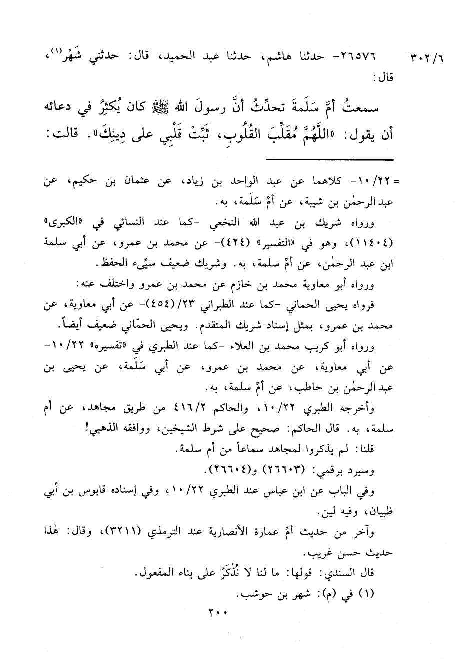 ٢٦٥٧٦ - حَدَّثَنَا هَاشِمٌ، حَدَّثَنَا عَبْدُ الْحَمِيدِ، قَالَ: حَدَّثَنِي شَهْرٌ (١) ، قَالَ: سَمِعْتُ أُمَّ سَلَمَةَ، تُحَدِّثُ أَنَّ رَسُولَ اللهِ صَلَّى اللهُ عَلَيْهِ وَسَلَّمَ كَانَ يُكْثِرُ فِي دُعَائِهِ أَنْ يَقُولَ: " اللهُمَّ مُقَلِّبَ الْقُلُوبِ، ثَبِّتْ قَلْبِي عَلَى دِينِكَ ". قَالَتْ: