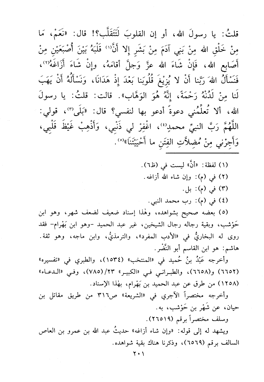 قُلْتُ: يَا رَسُولَ اللهِ، أَوَ إِنَّ الْقُلُوبَ لَتَتَقَلَّبُ؟ قَالَ: " نَعَمْ، مَا مِنْ خَلْقِ اللهِ مِنْ بَنِي آدَمَ مِنْ بَشَرٍ إِلَّا أَنَّ (١) قَلْبَهُ بَيْنَ أُصْبُعَيْنِ مِنْ أَصَابِعِ اللهِ، فَإِنْ شَاءَ اللهُ عَزَّ وَجَلَّ أَقَامَهُ، وَإِنْ شَاءَ أَزَاغَهُ (٢) ، فَنَسْأَلُ اللهَ رَبَّنَا أَنْ لَا يُزِيغَ قُلُوبَنَا بَعْدَ إِذْ هَدَانَا، وَنَسْأَلُهُ أَنْ يَهَبَ لَنَا مِنْ لَدُنْهُ رَحْمَةً، إِنَّهُ هُوَ الْوَهَّابُ "