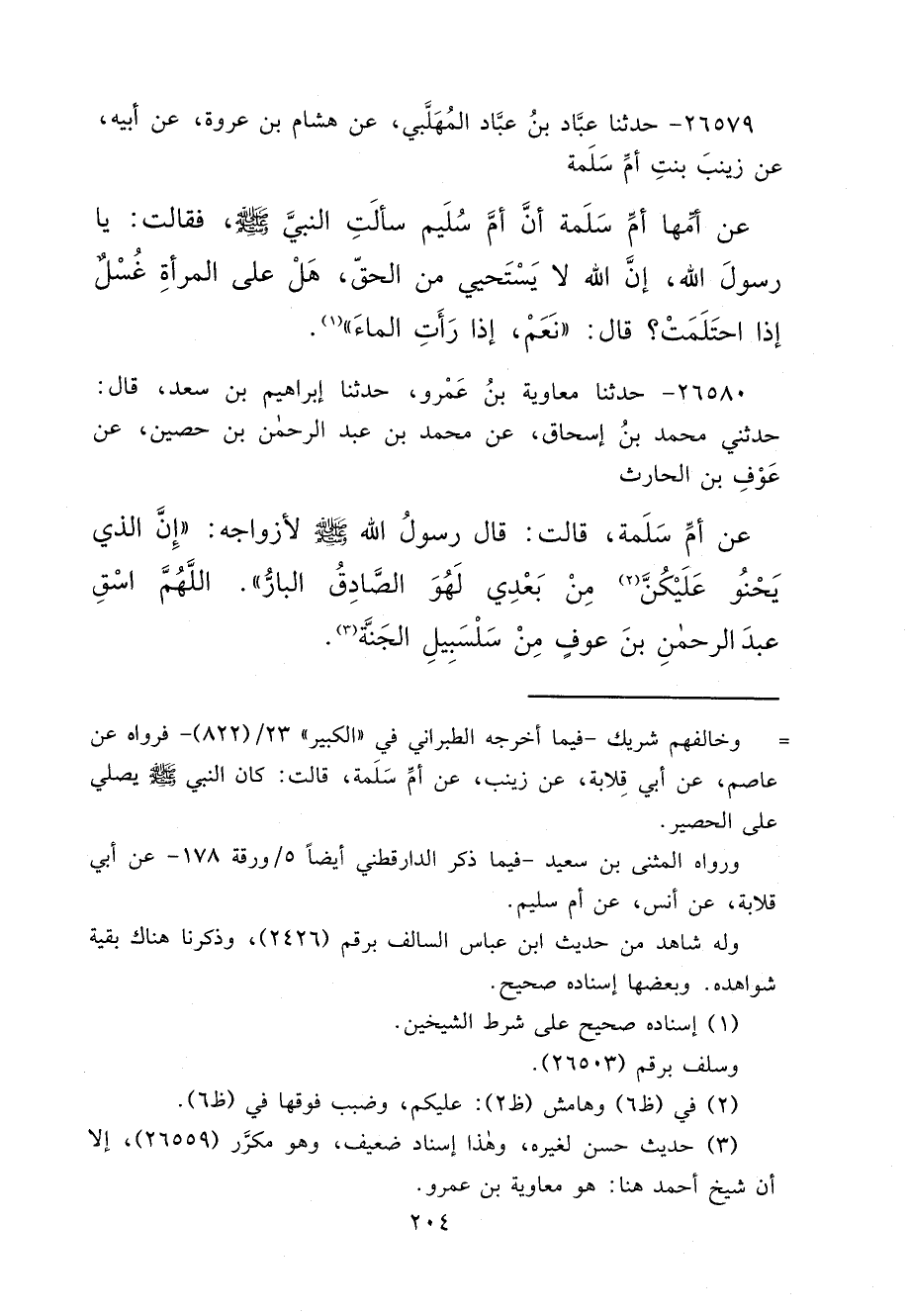 ٢٦٥٧٩ - حَدَّثَنَا عَبَّادُ بْنُ عَبَّادٍ الْمُهَلَّبِيُّ، عَنْ هِشَامِ بْنِ عُرْوَةَ، عَنْ أَبِيهِ، عَنْ زَيْنَبَ بِنْتِ أُمِّ سَلَمَةَ، عَنْ أُمِّهَا أُمِّ سَلَمَةَ، أَنَّ أُمَّ سُلَيْمٍ سَأَلَتِ النَّبِيَّ صَلَّى اللهُ عَلَيْهِ وَسَلَّمَ، فَقَالَتْ: يَا رَسُولَ اللهِ، إِنَّ اللهَ لَا يَسْتَحْيِي مِنَ الْحَقِّ، هَلْ عَلَى الْمَرْأَةِ غُسْلٌ إِذَا احْتَلَمَتْ؟ قَالَ: " نَعَمْ، إِذَا رَأَتِ الْمَاءَ " (١)