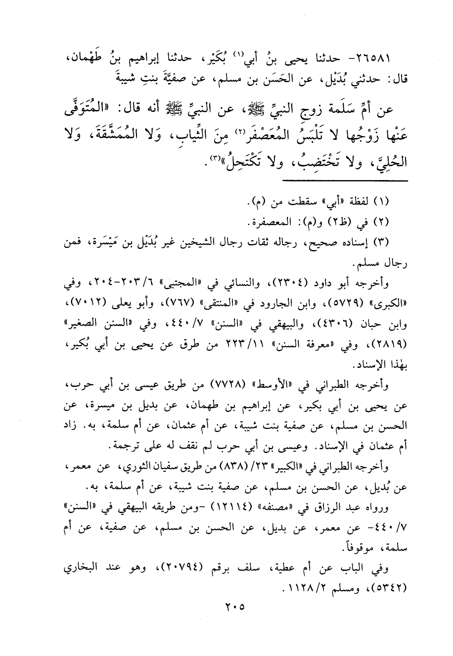 ٢٦٥٨١ - حَدَّثَنَا يَحْيَى بْنُ أَبِي (١) بُكَيْرٍ، حَدَّثَنَا إِبْرَاهِيمُ بْنُ طَهْمَانَ، قَالَ: حَدَّثَنِي بُدَيْلٌ، عَنِ الْحَسَنِ بْنِ مُسْلِمٍ، عَنْ صَفِيَّةَ بِنْتِ شَيْبَةَ، عَنْ أُمِّ سَلَمَةَ، زَوْجِ النَّبِيِّ صَلَّى اللهُ عَلَيْهِ وَسَلَّمَ، عَنِ النَّبِيِّ صَلَّى اللهُ عَلَيْهِ وَسَلَّمَ أَنَّهُ قَالَ: " الْمُتَوَفَّى عَنْهَا زَوْجُهَا لَا تَلْبَسُ الْمُعَصْفَرَ (٢) مِنَ الثِّيَابِ، وَلَا الْمُمَشَّقَةَ، وَلَا الْحُلِيَّ، وَلَا تَخْتَضِبُ، وَلَا تَكْتَحِلُ " (٣)