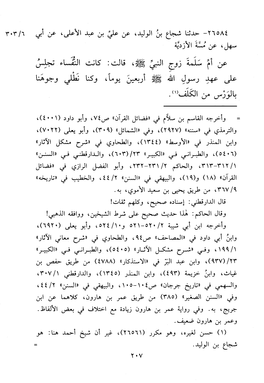 ٢٦٥٨٤ - حَدَّثَنَا شُجَاعُ بْنُ الْوَلِيدِ، عَنْ عَلِيِّ بْنِ عَبْدِ الْأَعْلَى، عَنْ أَبِي سَهْلٍ، عَنْ مُسَّةَ الْأَزْدِيَّةِ، عَنْ أُمِّ سَلَمَةَ، زَوْجِ النَّبِيِّ صَلَّى اللهُ عَلَيْهِ وَسَلَّمَ، قَالَتْ: " كَانَتْ النُّفَسَاءُ تَجْلِسُ عَلَى عَهْدِ رَسُولِ اللهِ صَلَّى اللهُ عَلَيْهِ وَسَلَّمَ أَرْبَعِينَ يَوْمًا، وَكُنَّا نَطْلِي وُجُوهَنَا بِالْوَرْسِ مِنَ الْكَلَفِ " (١)