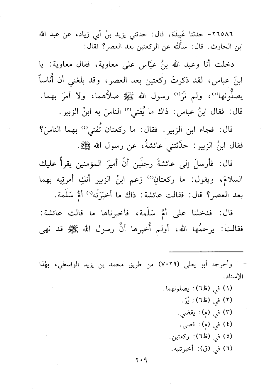 ٢٦٥٨٦ - حَدَّثَنَا عَبِيدَةُ، قَالَ: حَدَّثَنِي يَزِيدُ بْنُ أَبِي زِيَادٍ، عَنْ عَبْدِ اللهِ بْنِ الْحَارِثِ، قَالَ: سَأَلْتُهُ عَنِ الرَّكْعَتَيْنِ، بَعْدَ الْعَصْرِ؟ فَقَالَ: دَخَلْتُ أَنَا وَعَبْدُ اللهِ بْنُ عَبَّاسٍ عَلَى مُعَاوِيَةَ، فَقَالَ مُعَاوِيَةُ: يَا ابْنَ عَبَّاسٍ، لَقَدْ ذَكَرْتَ رَكْعَتَيْنِ بَعْدَ الْعَصْرِ، وَقَدْ بَلَغَنِي أَنَّ أُنَاسًا يُصَلُّونَهَا (١) ، وَلَمْ نَرَ (٢) رَسُولَ اللهِ صَلَّى اللهُ عَلَيْهِ وَسَلَّمَ صَلَّاهُمَا، وَلَا أَمَرَ بِهِمَا. قَالَ: فَقَالَ ابْنُ عَبَّاسٍ: ذَاكَ مَا يُفْتِي (٣) النَّاسُ بِهِ ابْنُ الزُّبَيْرِ. قَالَ: فَجَاءَ ابْنُ الزُّبَيْرِ. فَقَالَ: مَا رَكْعَتَانِ تُفْتِي (٤) بِهِمَا النَّاسُ؟ فَقَالَ ابْنُ الزُّبَيْرِ: حَدَّثَتْنِي عَائِشَةُ، عَنْ رَسُولِ اللهِ صَلَّى اللهُ عَلَيْهِ وَسَلَّمَ. قَالَ: فَأَرْسَلَ إِلَى عَائِشَةَ رَجُلَيْنِ أَنَّ أَمِيرَ الْمُؤْمِنِينَ يَقْرَأُ عَلَيْكِ السَّلَامَ، وَيَقُولُ: مَا رَكْعَتَانِ (٥) زَعَمَ ابْنُ الزُّبَيْرِ أَنَّكِ أَمَرْتِيهِ بِهِمَا بَعْدَ الْعَصْرِ؟ قَالَ: فَقَالَتْ عَائِشَةُ: ذَاكَ مَا أَخْبَرَتْهُ (٦) أُمُّ سَلَمَةَ، قَالَ: فَدَخَلْنَا عَلَى أُمِّ سَلَمَةَ، فَأَخْبَرْنَاهَا مَا قَالَتْ عَائِشَةُ: فَقَالَتْ: يَرْحَمُهَا اللهُ، أَوَلَمْ أُخْبِرْهَا " أَنَّ رَسُولَ اللهِ صَلَّى اللهُ عَلَيْهِ وَسَلَّمَ قَدْ نَهَى