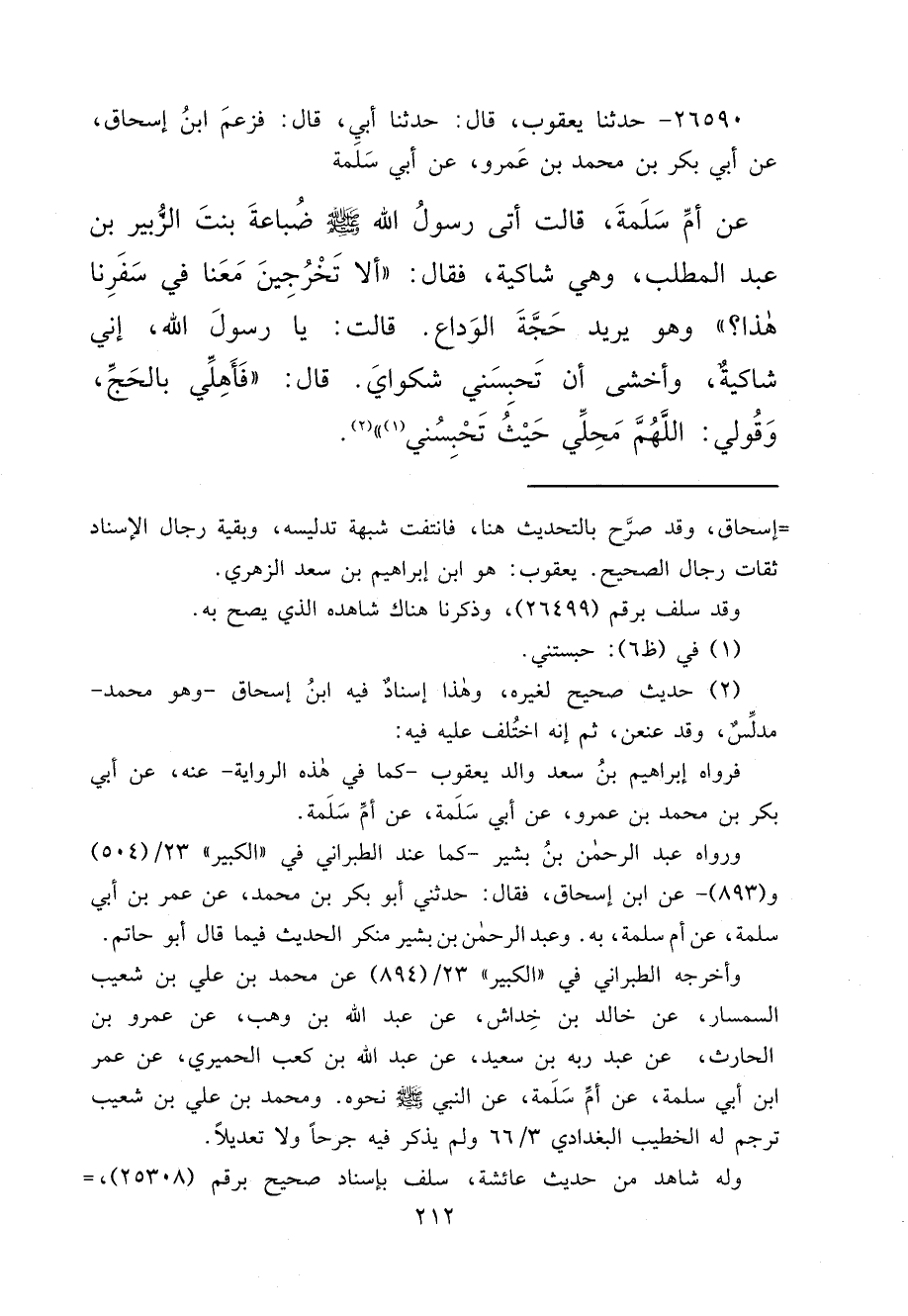 ٢٦٥٩٠ - حَدَّثَنَا يَعْقُوبُ، قَالَ: حَدَّثَنَا أَبِي، قَالَ: فَزَعَمَ ابْنُ إِسْحَاقَ، عَنْ أَبِي بَكْرِ بْنِ مُحَمَّدِ بْنِ عَمْرٍو، عَنْ أَبِي سَلَمَةَ، عَنْ أُمِّ سَلَمَةَ، قَالَتْ: أَتَى رَسُولُ اللهِ صَلَّى اللهُ عَلَيْهِ وَسَلَّمَ ضُبَاعَةَ بِنْتَ الزُّبَيْرِ بْنِ عَبْدِ الْمُطَّلِبِ وَهِيَ شَاكِيَةٌ، فَقَالَ: " أَلَا تَخْرُجِينَ مَعَنَا فِي سَفَرِنَا هَذَا؟ " وَهُوَ يُرِيدُ حَجَّةَ الْوَدَاعِ. قَالَتْ: يَا رَسُولَ اللهِ، إِنِّي شَاكِيَةٌ، وَأَخْشَى أَنْ تَحْبِسَنِي شَكْوَايَ. قَالَ: " فَأَهِلِّي بِالْحَجِّ، وَقُولِي: اللهُمَّ مَحِلِّي حَيْثُ تَحْبِسُنِي (١) " (٢)