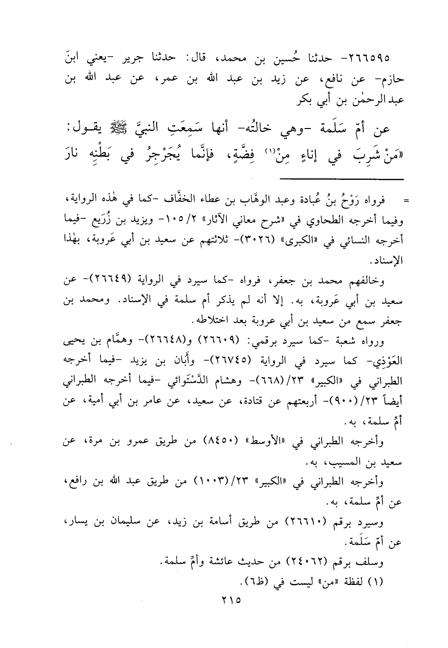 ٢٦٥٩٥ - حَدَّثَنَا حُسَيْنُ بْنُ مُحَمَّدٍ قَالَ: حَدَّثَنَا جَرِيرٌ يَعْنِي ابْنَ حَازِمٍ، عَنْ نَافِعٍ، عَنْ زَيْدِ بْنِ عَبْدِ اللهِ بْنِ عُمَرَ، عَنْ عَبْدِ اللهِ بْنِ عَبْدِ الرَّحْمَنِ بْنِ أَبِي بَكْرٍ، عَنْ أُمِّ سَلَمَةَ، وَهِيَ خَالَتُهُ، أَنَّهَا سَمِعَتِ النَّبِيَّ صَلَّى اللهُ عَلَيْهِ وَسَلَّمَ يَقُولُ: " مَنْ شَرِبَ فِي إِنَاءٍ مِنْ (١) فِضَّةٍ، فَإِنَّمَا يُجَرْجِرُ فِي بَطْنِهِ نَارَ