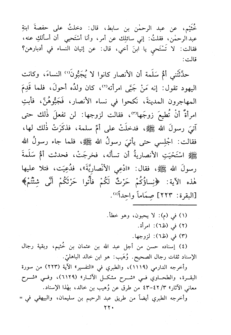 خُثَيْمٍ، عَنْ عَبْدِ الرَّحْمَنِ بْنِ سَابِطٍ، قَالَ: دَخَلْتُ عَلَى حَفْصَةَ ابْنَةِ عَبْدِ الرَّحْمَنِ، فَقُلْتُ: إِنِّي سَائِلُكِ عَنْ أَمْرٍ، وَأَنَا أَسْتَحْيِي أَنْ أَسْأَلَكَ عَنْهُ، فَقَالَتْ: لَا تَسْتَحِي يَا ابْنَ أَخِي، قَالَ: عَنْ إِتْيَانِ النِّسَاءِ فِي أَدْبَارِهِنَّ؟ قَالَتْ: حَدَّثَتْنِي أُمُّ سَلَمَةَ، أَنَّ الْأَنْصَارَ كَانُوا لَا يُجِبُّونَ (١) النِّسَاءَ، وَكَانَتِ الْيَهُودُ تَقُولُ: إِنَّهُ مَنْ جَبَّى امْرَأَتَهُ (٢) ، كَانَ وَلَدُهُ أَحْوَلَ، فَلَمَّا قَدِمَ الْمُهَاجِرُونَ الْمَدِينَةَ، نَكَحُوا فِي نِسَاءِ الْأَنْصَارِ، فَجَبُّوهُنَّ، فَأَبَتْ امْرَأَةٌ أَنْ تُطِيعَ زَوْجَهَا (٣) ، فَقَالَتْ لِزَوْجِهَا: لَنْ تَفْعَلَ ذَلِكَ حَتَّى آتِيَ رَسُولَ اللهِ صَلَّى اللهُ عَلَيْهِ وَسَلَّمَ، فَدَخَلَتْ عَلَى أُمِّ سَلَمَةَ، فَذَكَرَتْ ذَلِكَ لَهَا، فَقَالَتْ: اجْلِسِي حَتَّى يَأْتِيَ رَسُولُ اللهِ صَلَّى اللهُ عَلَيْهِ وَسَلَّمَ، فَلَمَّا جَاءَ رَسُولُ اللهِ صَلَّى اللهُ عَلَيْهِ وَسَلَّمَ اسْتَحْيَتِ الْأَنْصَارِيَّةُ أَنْ تَسْأَلَهُ، فَخَرَجَتْ، فَحَدَّثَتْ أُمُّ سَلَمَةَ، رَسُولَ اللهِ صَلَّى اللهُ عَلَيْهِ وَسَلَّمَ، فَقَالَ: " ادْعِي الْأَنْصَارِيَّةَ "، فَدُعِيَتْ، فَتَلَا عَلَيْهَا هَذِهِ الْآيَةَ: {نِسَاؤُكُمْ حَرْثٌ لَكُمْ فَأْتُوا حَرْثَكُمْ أَنَّى شِئْتُمْ} [البقرة: ٢٢٣] صِمَامًا وَاحِدًا (٤)