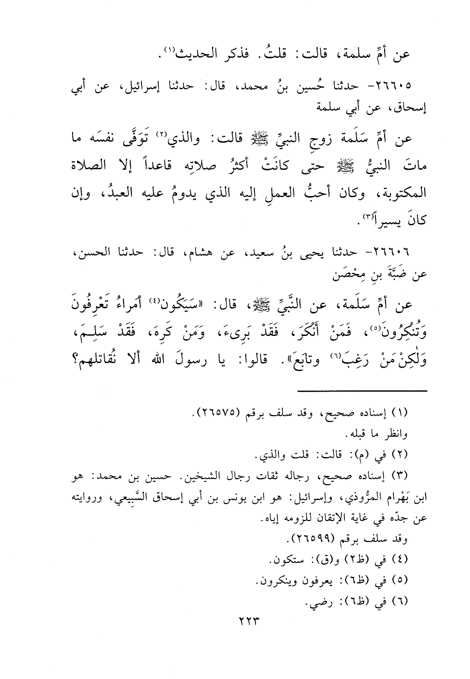 ٢٦٦٠٦ - حَدَّثَنَا يَحْيَى بْنُ سَعِيدٍ، عَنْ هِشَامٍ، قَالَ: حَدَّثَنَا الْحَسَنُ، عَنْ ضَبَّةَ بْنِ مُحْصِنٍ، عَنْ أُمِّ سَلَمَةَ، عَنِ النَّبِيِّ صَلَّى اللهُ عَلَيْهِ وَسَلَّمَ قَالَ: " سَيَكُونُ (٤) أُمَرَاءُ تَعْرِفُونَ وَتُنْكِرُونَ (٥) ، فَمَنْ أَنْكَرَ فَقَدْ بَرِئَ، وَمَنْ كَرِهَ، فَقَدْ سَلِمَ، وَلَكِنْ مَنْ رَغِبَ (٦) وَتَابَعَ ". قَالُوا: يَا رَسُولَ اللهِ أَلَا نُقَاتِلُهُمْ؟