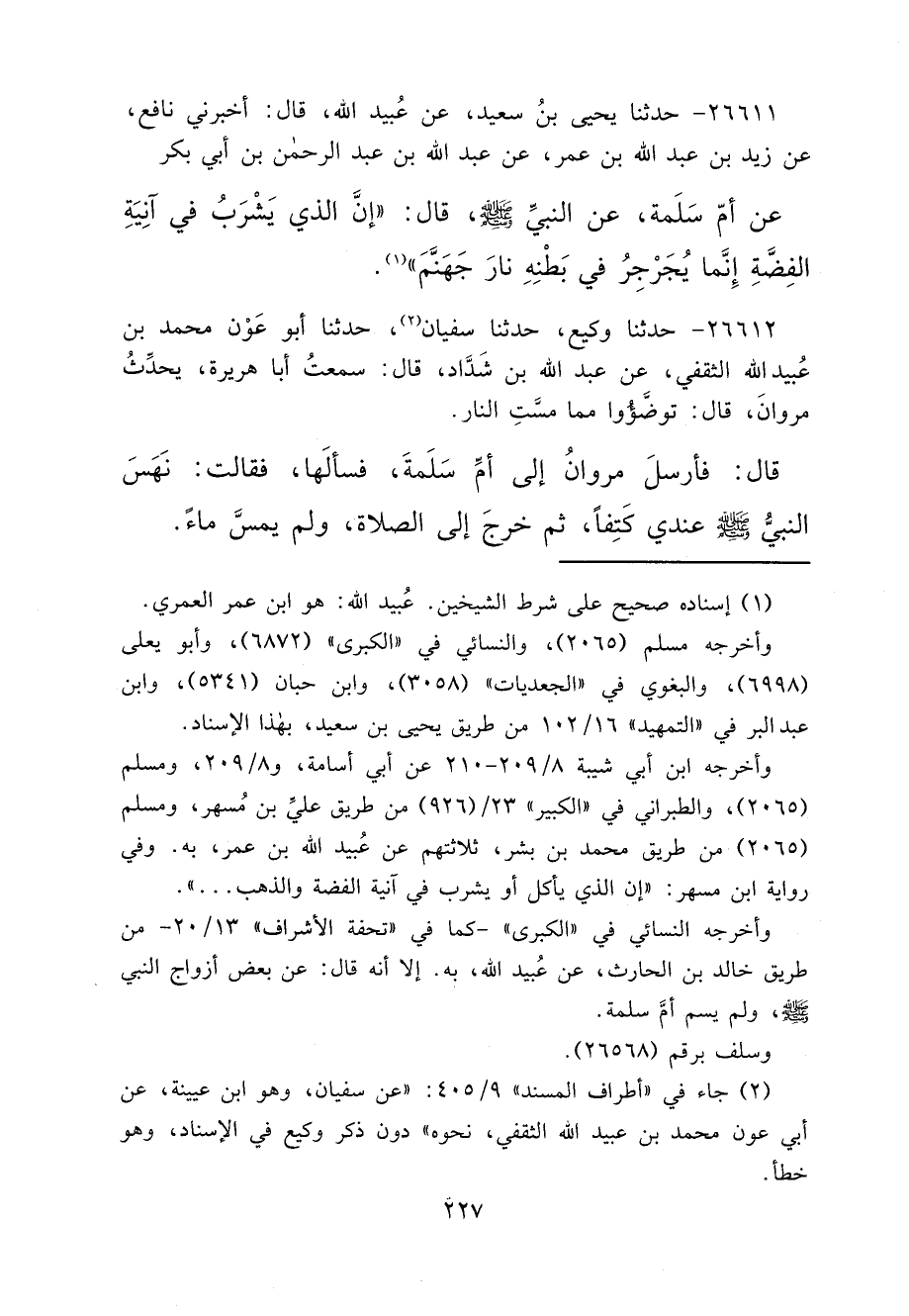 ٢٦٦١١ - حَدَّثَنَا يَحْيَى بْنُ سَعِيدٍ، عَنْ عُبَيْدِ اللهِ، قَالَ: أَخْبَرَنِي نَافِعٌ، عَنْ زَيْدِ بْنِ عَبْدِ اللهِ بْنِ عُمَرَ، عَنْ عَبْدِ اللهِ بْنِ عَبْدِ الرَّحْمَنِ بْنِ أَبِي بَكْرٍ، عَنْ أُمِّ سَلَمَةَ، عَنِ النَّبِيِّ صَلَّى اللهُ عَلَيْهِ وَسَلَّمَ قَالَ: " إِنَّ الَّذِي يَشْرَبُ فِي آنِيَةِ الْفِضَّةِ، إِنَّمَا يُجَرْجِرُ فِي بَطْنِهِ نَارَ جَهَنَّمَ " (١)