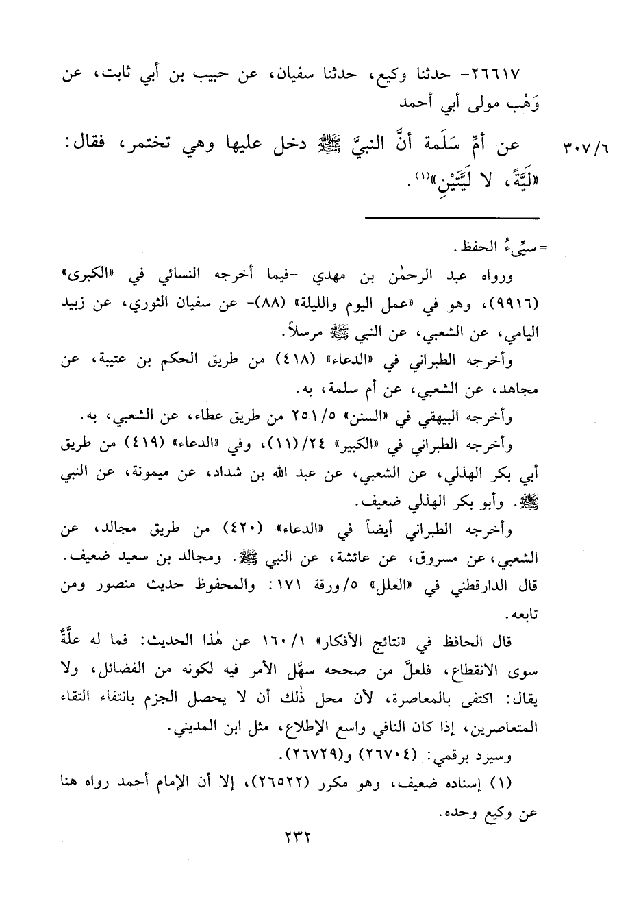 ٢٦٦١٧ - حَدَّثَنَا وَكِيعٌ، حَدَّثَنَا سُفْيَانُ، عَنْ حَبِيبِ بْنِ أَبِي ثَابِتٍ، عَنْ وَهْبٍ، مَوْلَى أَبِي أَحْمَدَ، عَنْ أُمِّ سَلَمَةَ، أَنَّ النَّبِيَّ صَلَّى اللهُ عَلَيْهِ وَسَلَّمَ دَخَلَ عَلَيْهَا وَهِيَ تَخْتَمِرُ، فَقَالَ: " لَيَّةً، لَا لَيَّتَيْنِ " (١)