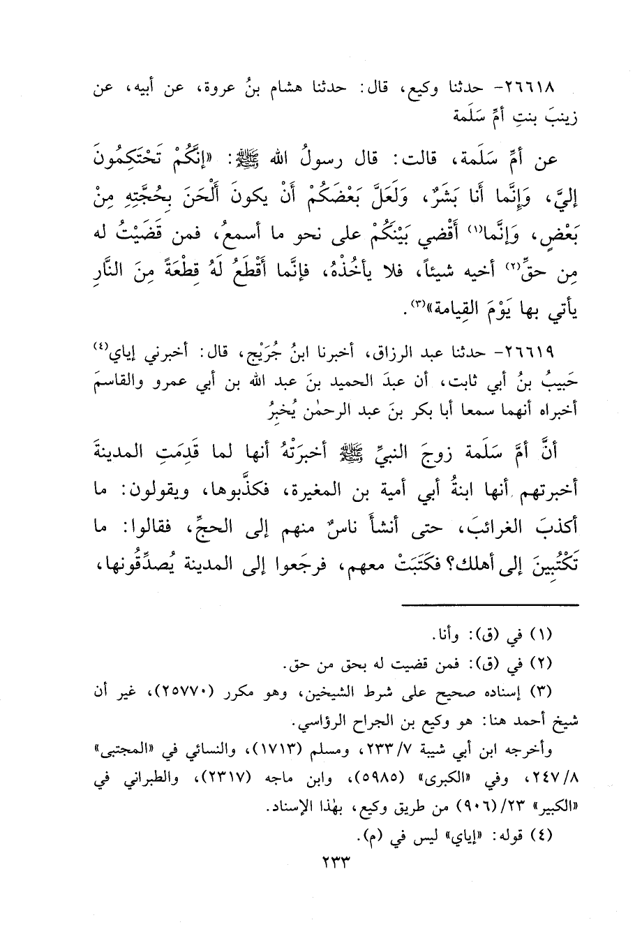 ٢٦٦١٨ - حَدَّثَنَا وَكِيعٌ، قَالَ: حَدَّثَنَا هِشَامُ بْنُ عُرْوَةَ، عَنْ أَبِيهِ، عَنْ زَيْنَبَ بِنْتِ أُمِّ سَلَمَةَ، عَنْ أُمِّ سَلَمَةَ، قَالَتْ: قَالَ رَسُولُ اللهِ صَلَّى اللهُ عَلَيْهِ وَسَلَّمَ: " إِنَّكُمْ تَحْتَكِمُونَ إِلَيَّ، وَإِنَّمَا أَنَا بَشَرٌ، وَلَعَلَّ بَعْضَكُمْ أَنْ يَكُونَ أَلْحَنَ بِحُجَّتِهِ مِنْ بَعْضٍ، وَإِنَّمَا (١) أَقْضِي بَيْنَكُمْ عَلَى نَحْوِ مَا أَسْمَعُ، فَمَنْ قَضَيْتُ لَهُ مِنْ حَقِّ (٢) أَخِيهِ شَيْئًا، فَلَا يَأْخُذْهُ، فَإِنَّمَا أَقْطَعُ لَهُ قِطْعَةً مِنَ النَّارِ يَأْتِي بِهَا يَوْمَ الْقِيَامَةِ " (٣)