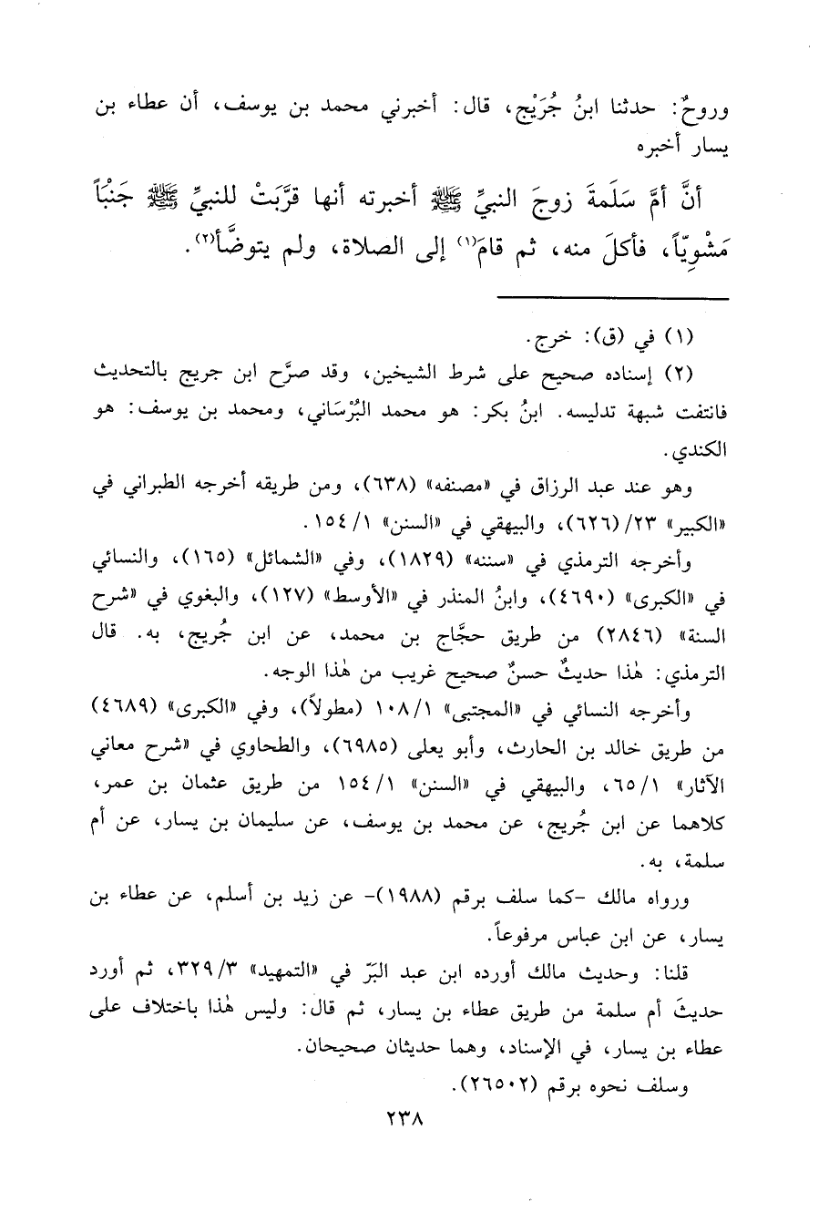 وَرَوْحٌ، حَدَّثَنَا ابْنُ جُرَيْجٍ، قَالَ: أَخْبَرَنِي مُحَمَّدُ بْنُ يُوسُفَ، أَنَّ عَطَاءَ بْنَ يَسَارٍ، أَخْبَرَهُ أَنَّ أُمَّ سَلَمَةَ، زَوْجَ النَّبِيِّ صَلَّى اللهُ عَلَيْهِ وَسَلَّمَ أَخْبَرَتْهُ، أَنَّهَا " قَرَّبَتْ لِلنَّبِيِّ صَلَّى اللهُ عَلَيْهِ وَسَلَّمَ جَنْبًا مَشْوِيًّا، فَأَكَلَ مِنْهُ، ثُمَّ قَامَ (١) إِلَى الصَّلَاةِ، وَلَمْ يَتَوَضَّأْ " (٢)