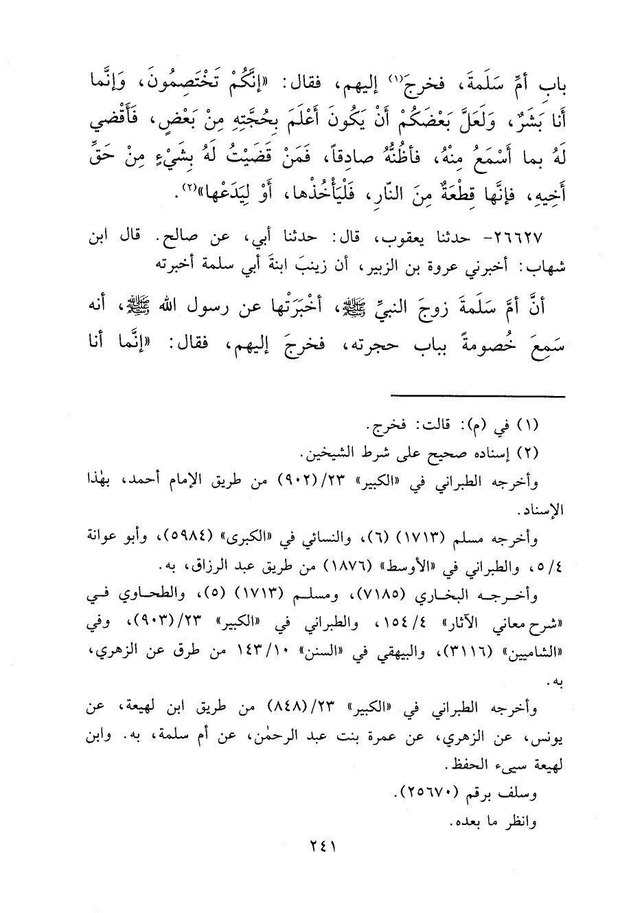 ٢٦٦٢٧ - حَدَّثَنَا يَعْقُوبُ، قَالَ: حَدَّثَنَا أَبِي، عَنْ صَالِحٍ، قَالَ ابْنُ شِهَابٍ: أَخْبَرَنِي عُرْوَةُ بْنُ الزُّبَيْرِ، أَنَّ زَيْنَبَ ابْنَةَ أَبِي سَلَمَةَ، أَخْبَرَتْهُ أَنَّ أُمَّ سَلَمَةَ زَوْجَ النَّبِيِّ صَلَّى اللهُ عَلَيْهِ وَسَلَّمَ، أَخْبَرَتْهَا عَنْ رَسُولِ اللهِ صَلَّى اللهُ عَلَيْهِ وَسَلَّمَ، أَنَّهُ سَمِعَ خُصُومَةً بِبَابِ حُجْرَتِهِ، فَخَرَجَ إِلَيْهِمْ، فَقَالَ: " إِنَّمَا أَنَا