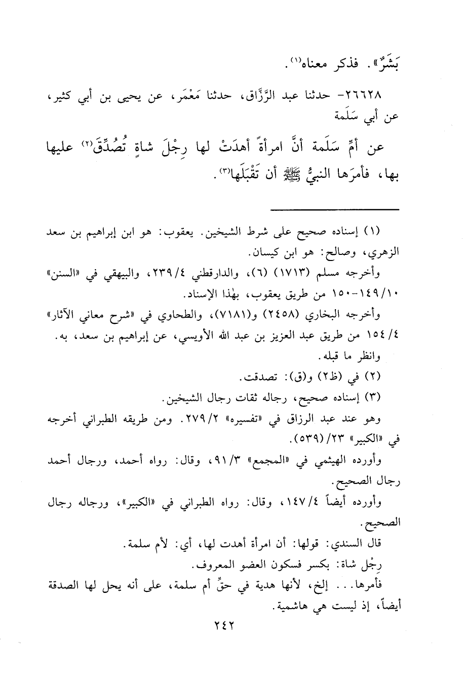 ٢٦٦٢٨ - حَدَّثَنَا عَبْدُ الرَّزَّاقِ، حَدَّثَنَا مَعْمَرٌ، عَنْ يَحْيَى بْنِ أَبِي كَثِيرٍ، عَنْ أَبِي سَلَمَةَ، عَنْ أُمِّ سَلَمَةَ، أَنَّ امْرَأَةً أَهْدَتْ لَهَا رِجْلَ شَاةٍ تُصُدِّقَ (٢) عَلَيْهَا بِهَا " فَأَمَرَهَا النَّبِيُّ صَلَّى اللهُ عَلَيْهِ وَسَلَّمَ أَنْ تَقْبَلَهَا " (٣)